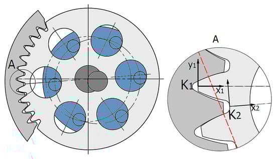 For a proper comparison of the test results, it is important to record the coordinate systems in which the results will be interpreted. Thus, the results of the simulations on the weakening effect of the tooth root are always plotted in the coordinate system K1 and K2 as shown in Figure 6. Where the x1 and x2 axes intersect the center of the planetary wheel.