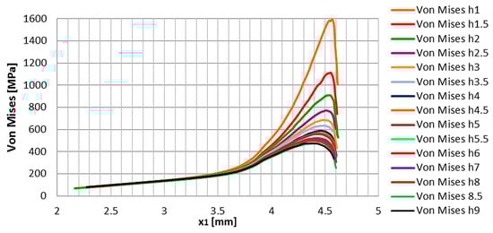 The weakening effect of the passing guiding hole is most significant at the tooth root. Here, the maximum stress value increases rapidly, and later, the location of its onset starts to migrate as the rim thickness becomes thinner. This can be seen in the diagram in Figure 8, which shows the Von Mises stresses on the compressed side of the rim for different rim thicknesses. Here, the abrupt rise of the stress peaks in the vicinity of the tooth root curve, i.e., the geometric discontinuity, can be observed.