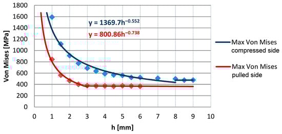 The stress variation on the pressed and pulled sides follows a similar trend, though the maximum stresses are lower on the pulled side, and the onset of the weakening effect occurs later. Here, we observe an increase in the maximum stress of the tooth root as a function of the rim thickness “h”, both on the pulled and the pressed side. When the value of the parameter h reaches a certain value, the stress growth follows a hyperbolic pattern.