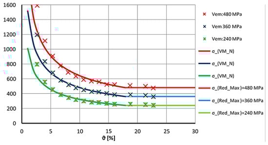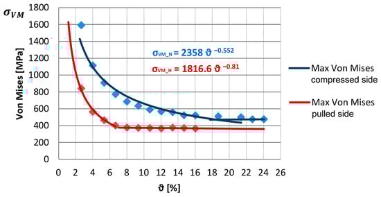 Figure 8 shows the variation in the maximum stress as a function of the number of retractions. On both the tensioned and compression sides, a limit ϑlim is observed where the weakening effect of the guiding hole starts to increase the value of the stresses. The mentioned ϑlim, i.e., the limit of the guiding ratio, is different for the tensioned and the compression side. For the compressed side, subtracting the design base value of the stress from the approximate equation gives the function whose zero position gives the value of ϑlim: