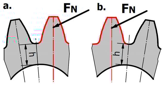 Therefore, the diagrams in the literature cannot be used in the present study, since the values of the tooth factors are developed for the case of the force applied at the tooth tip edge. By editing and measuring in CAD and then substituting the values obtained, the value of the tooth factor can be calculated, moreover, by this method, for any force applied at any arbitrary profile point. When determining the maximum of the reduced stress, it is also necessary to introduce the YSa stress concentration factor. Based on the literature, its value can be assumed to be between 1.5–1.7 and can be refined by means of a diagram as a function of the profile shift coefficient. However, since these models primarily describe the extracted side of the tooth, in this study, the factor is iteratively refined based on finite element method feedback [].