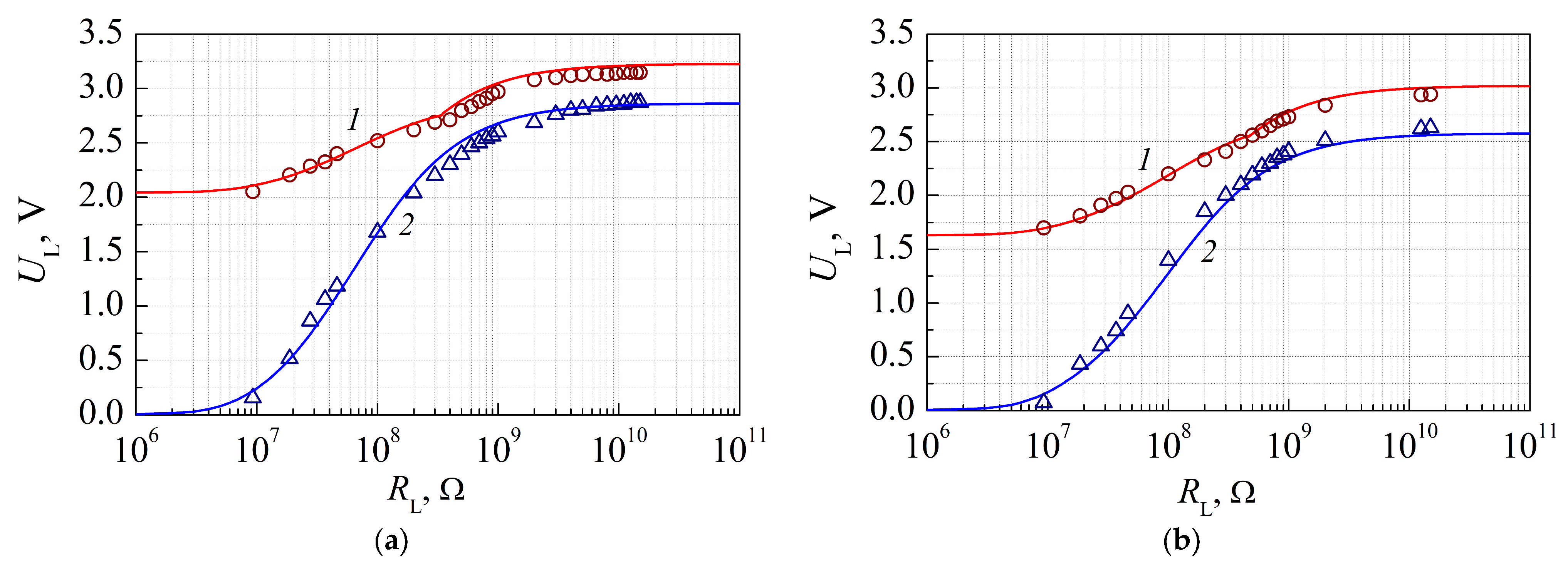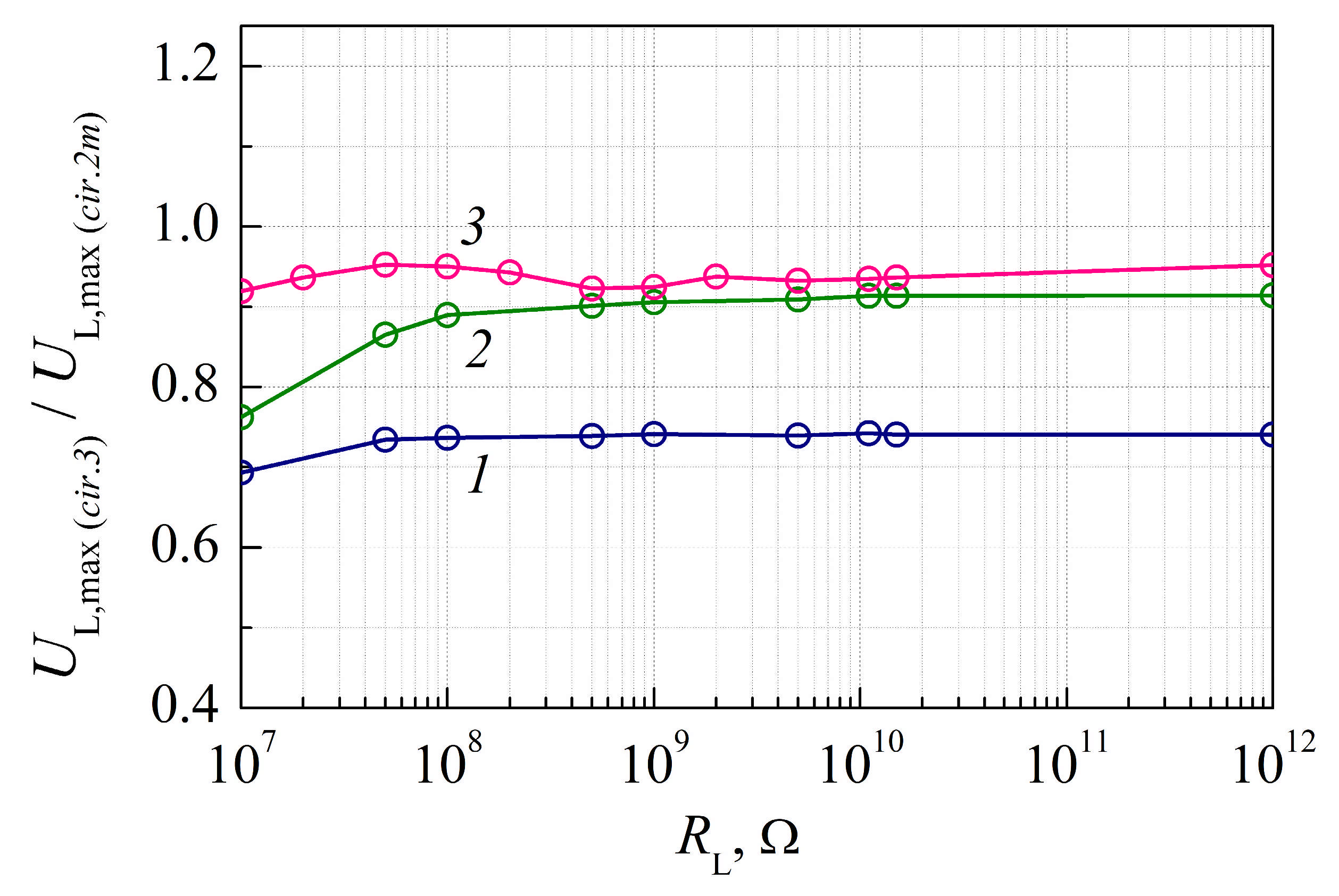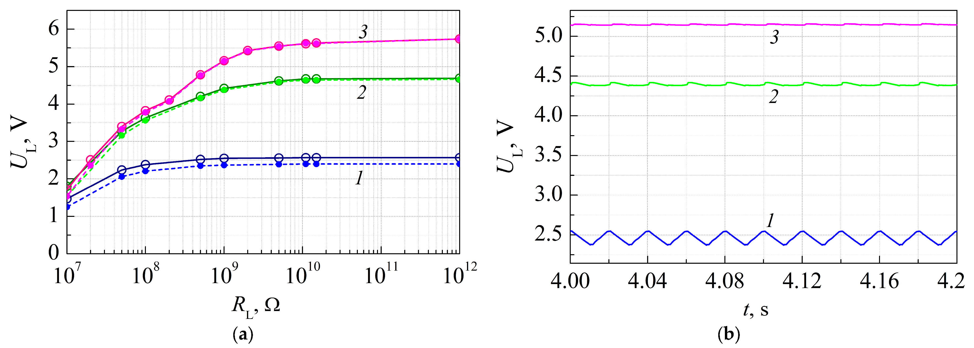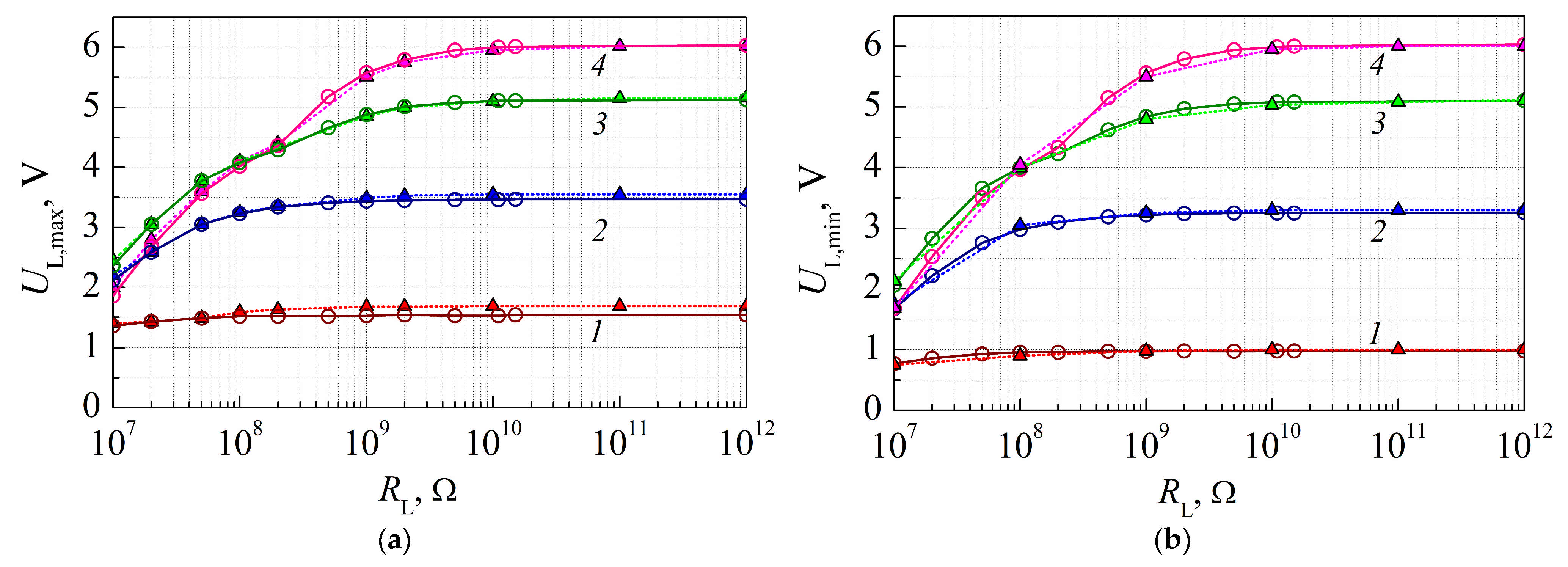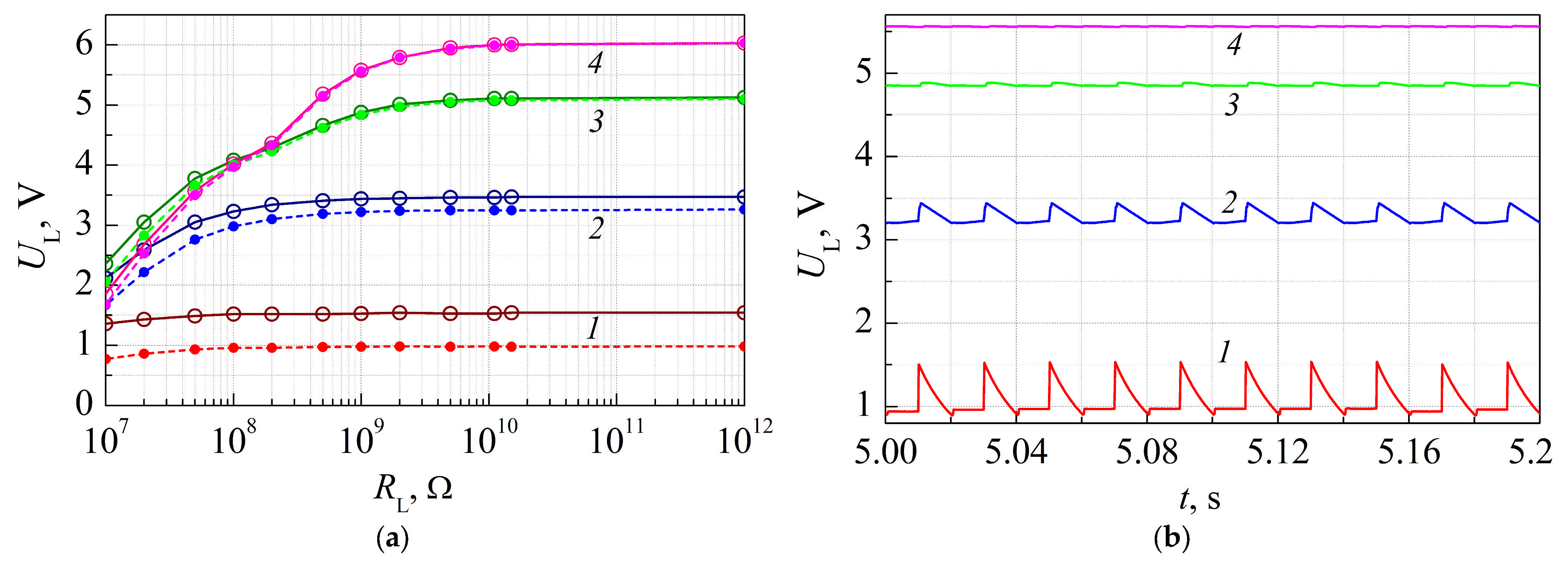 Figure 15 shows the dependences of the maximum and minimum load voltages versus the load resistance during the periodical connection of the capacitor