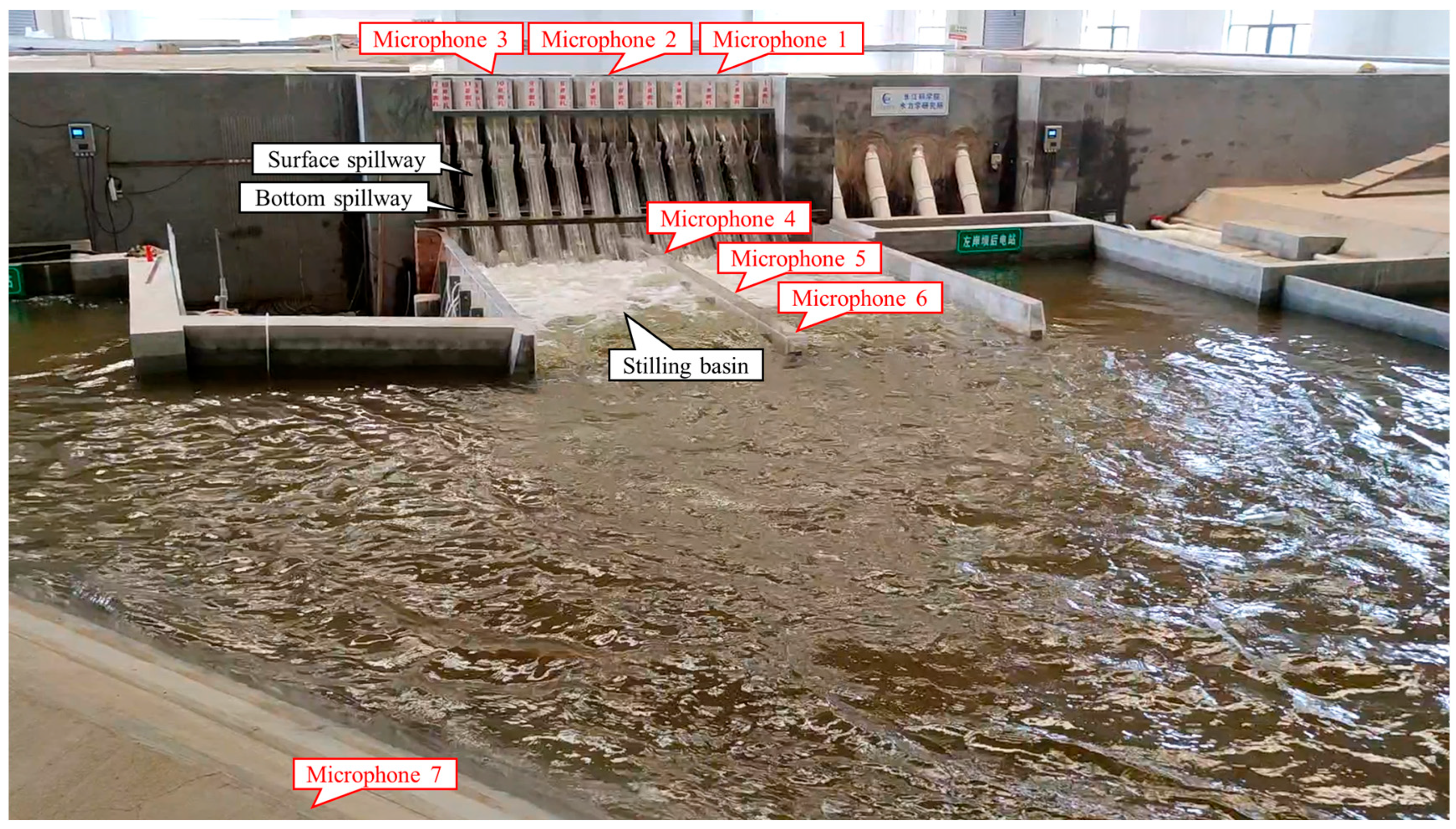 Figure 2. The model was positioned more than 20 m from the walls and 8 m from the ceiling of the test hall. Additionally, the terrain on both sides of the model’s stilling basin was simulated using materials with sound-absorbing properties. This site arrangement significantly mitigated the effects of environmental reverberation during testing. In the experiment, a total of 7 flood discharge noise measurement points were set: 3 on the dam crest, 3 on the partition wall of the stilling basin, and 1 at the viewing platform on the right bank, as illustrated in