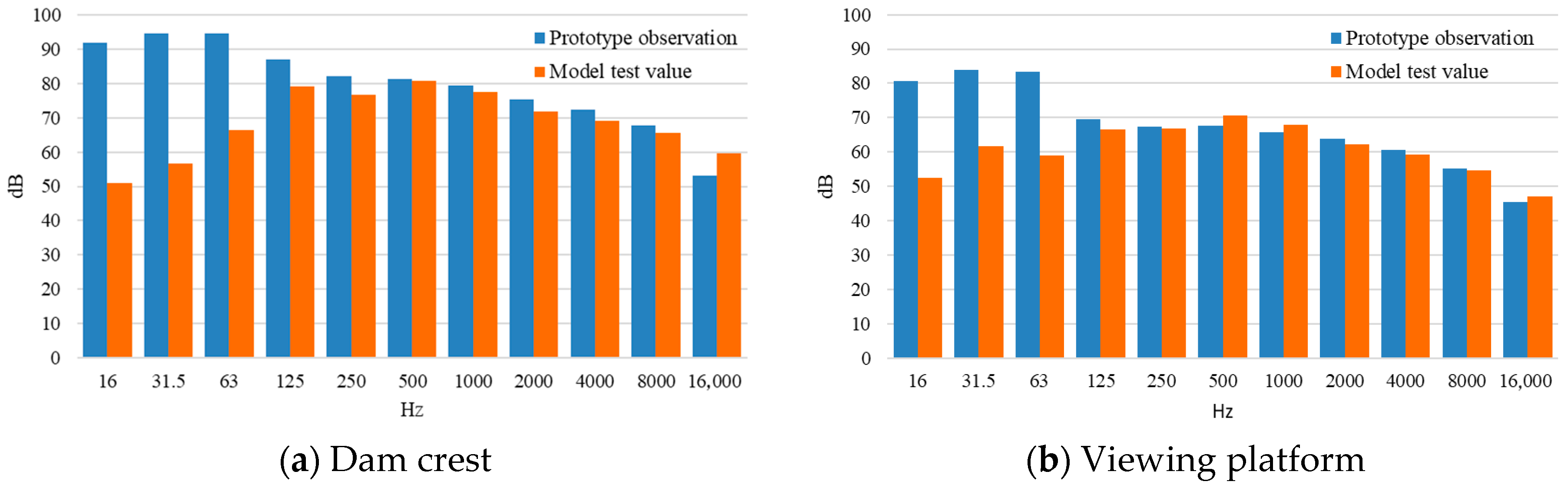 The sound intensity also requires scaling. The prototype spillway noise’s sound intensity was approximately 150 times greater than that in the model tests, consistent with the theoretical scaling of sound power with the square of the length scale for geometrically and dynamically similar sources.