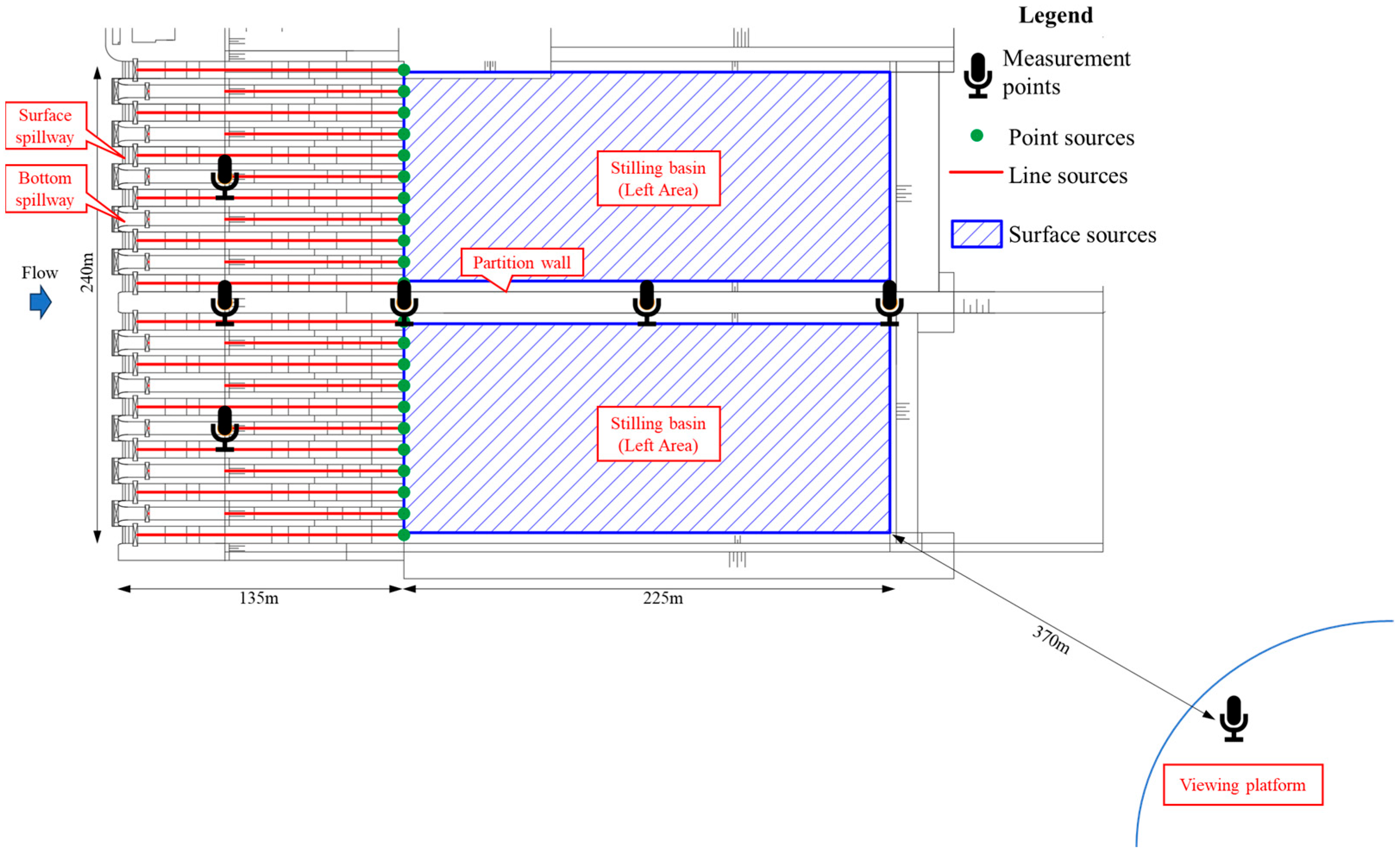Point sources: The flood discharge noise caused by localized turbulence at the outlets of 12 surface spillway flows and 10 bottom spillway flows as they impact the stilling basin can be approximated as point sources because the entry points are small relative to the overall noise field. A total of 22 point sources are identified for these flows entering the basin, as shown in