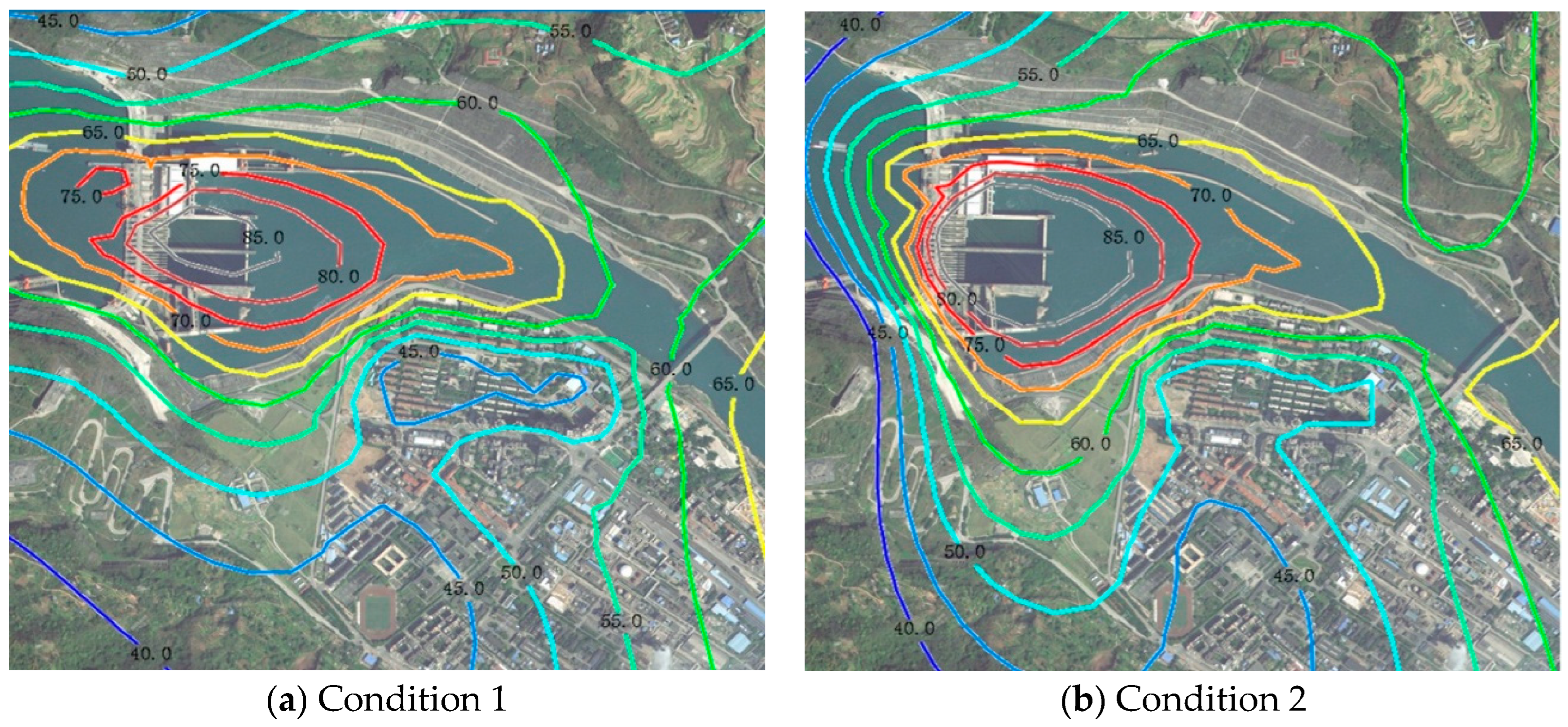 3. Strategic selection of surface spillways: If surface spillways must be operated, the specific gates activated can be selected based on sound field model predictions to minimize noise impact on the most sensitive downstream receptors (e.g., the residential area on the right bank). The model enables planners to simulate different gate-opening scenarios and identify the acoustically optimal configuration.