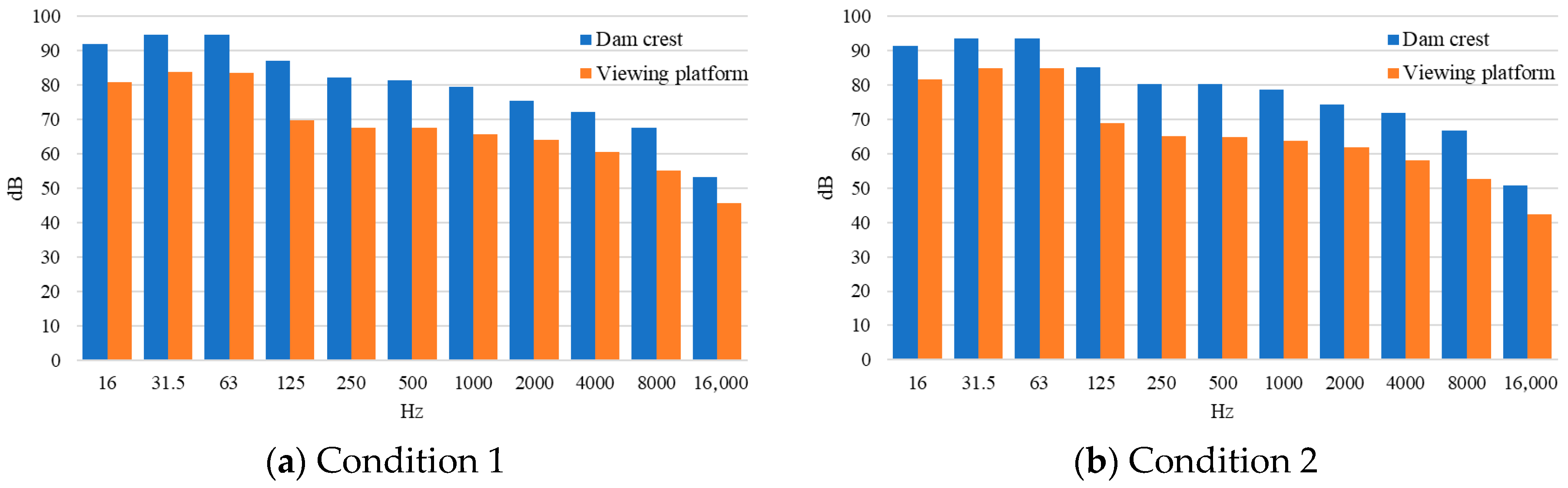 Figure 8, under all conditions, surface sound sources from the stilling basin are the primary contributors to flood discharge noise. This highlights that rolling water surface caused by water jets from the bottom and surface spillways entering the stilling basin is the main noise source.