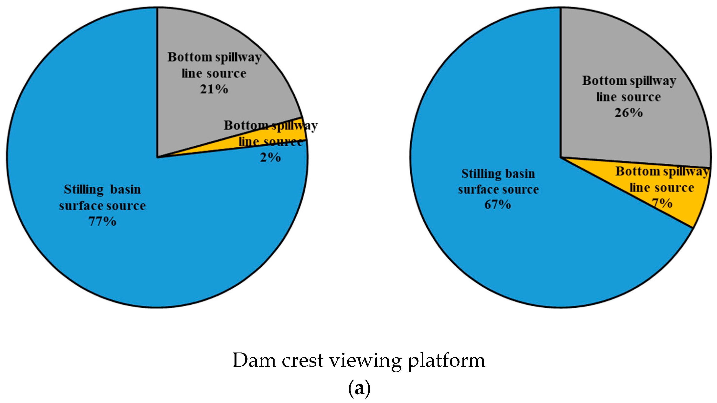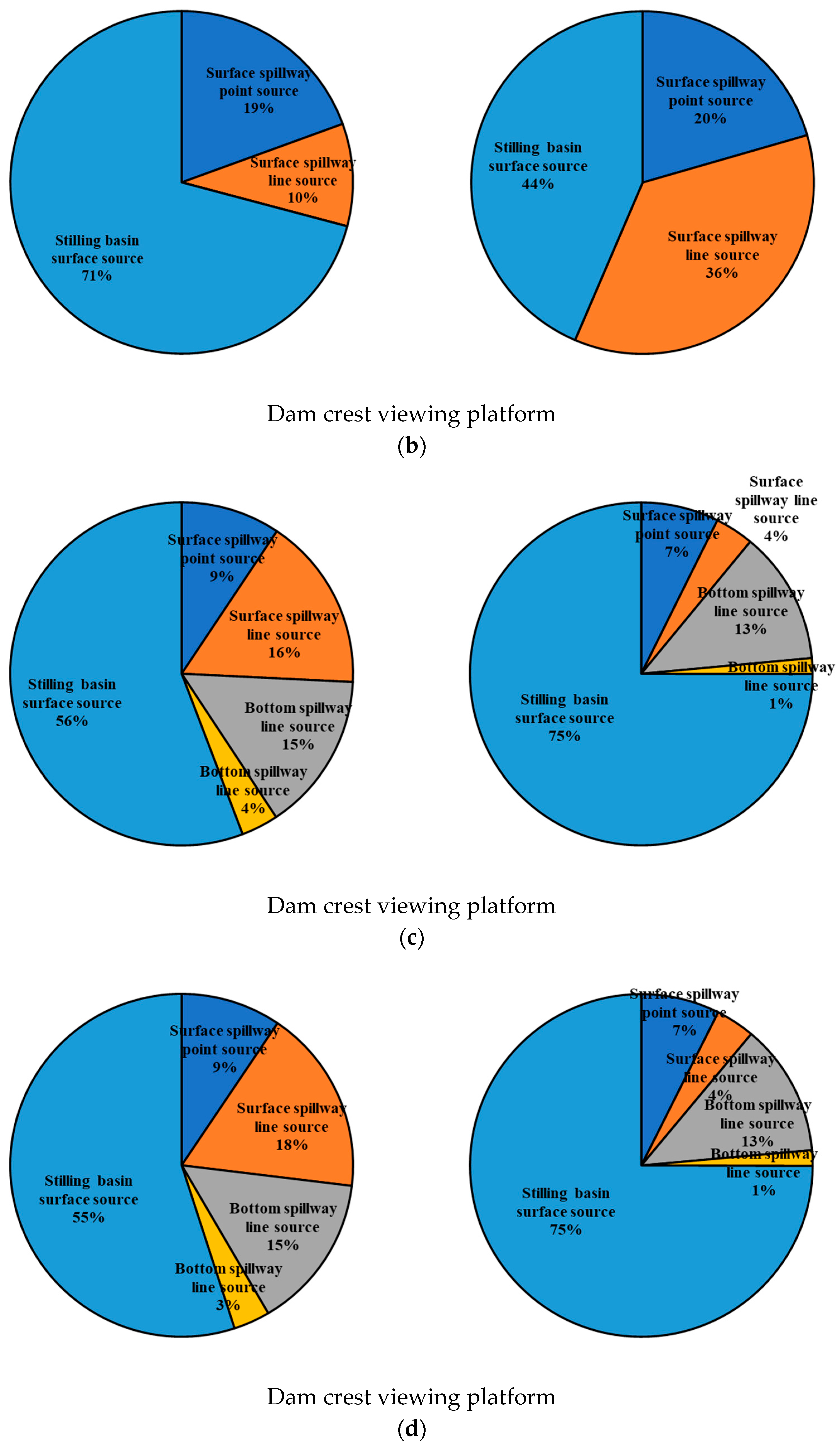 For these four conditions, the relative contribution of each source type (point, line, and surface) to the total noise level was calculated at two critical locations: the dam crest and the downstream viewing platform. The results are visualized in the pie charts shown in