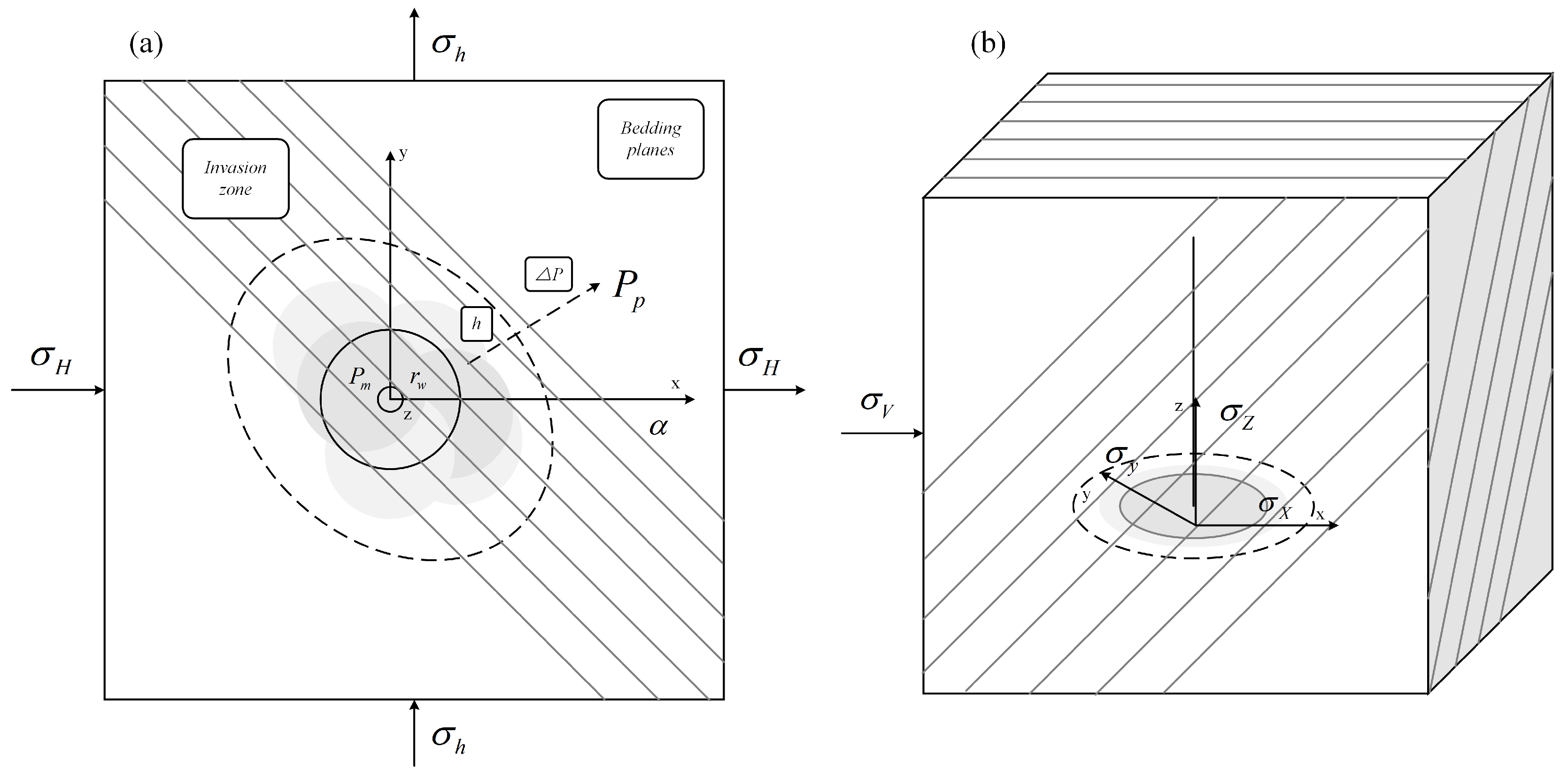 According to the above physical model, this paper presents the following basic assumptions: (1) Shale is a transversely isotropic elastic medium, with five independent elastic constants, where the isotropic plane is aligned with the bedding plane [25]. This assumption accounts for shale’s inborn anisotropic nature caused by its sedimentary nature and has been broadly utilized in shale wellbore instability analysis. (2) One set of parallel weak bedding planes will exist across the formation, being uniquely identified by dip angle α and strike. Even though several weak planes might exist in reality, the single-plane approximation identifies the major failure behavior and facilitates analysis [26]. (3) Drilling fluid invasion is a quasi-static diffusion process, where invasion depth h gradually increases with time t and pressure difference ΔP, while ignoring transient pressure fluctuation impacts. (4) This wellbore section away from the bottomhole obeys plane strain conditions, with axial deformation pinned by the adjacent formation. Stress–strain calculation is performed for the wellbore cross-section. (5) Stress distribution near the wellbore before invasion obeys the Lekhnitskii solution for isotropic materials in the cross-section. The stress concentration factor depends on elastic anisotropy and the orientation angle of the bedding plane with respect to in situ stress [27]. (6) Invasion of drilling fluid destroys the mechanical behavior of bedding planes, with cohesion c and inner friction angle φ decreasing exponentially with invasion depth h. On the other hand, the mechanical behavior of the intact matrix remains unchanged with respect to the timescale considered. Such assumptions form the theoretical basis for further stress calculation and collapse pressure estimation.