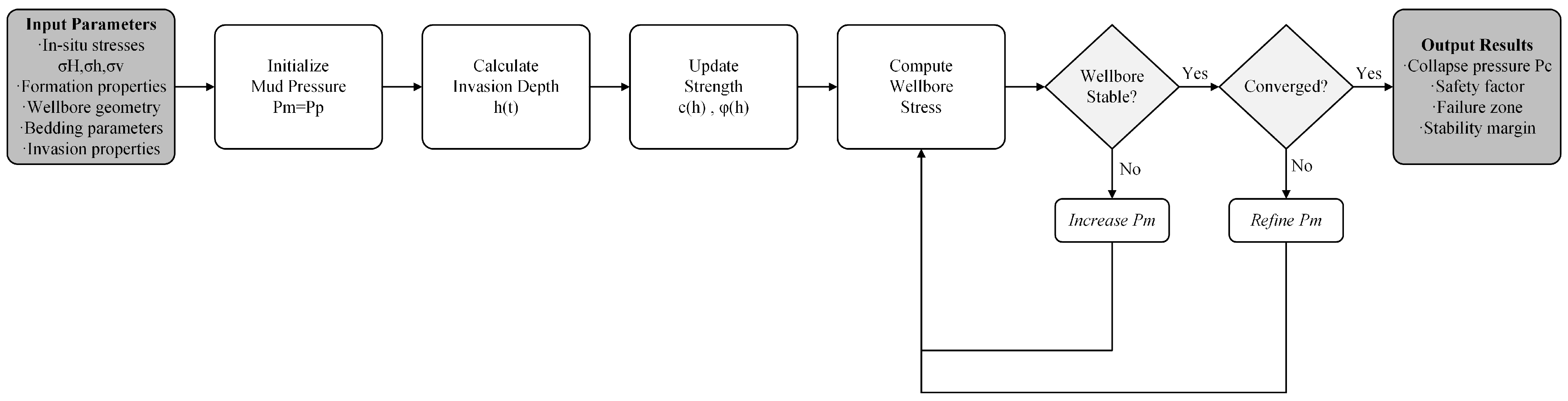 Collapse pressure Pc refers to the minimum mud pressure that will maintain a steady wellbore. We must first consider the state of stress (Equation (1)), how deep penetration has taken place (Equation (5)), how strength diminishes (Equations (3) and (4)), and slip rules (Equation (2)). Because this problem involves numerous complicated factors that are interrelated, this work adopts a step-by-step technique to obtain a solution, that particular step being depicted in Figure 2. The algorithm begins with a starting mud pressure Pm = pp. It then calculates how deep the drill goes, updates strength parameters, finds the stresses on the walls, and checks if the bedding plane is stable. If it is still unstable, the mud pressure is raised, and the process is repeated until it reaches the collapse pressure Pc [31,32]. This model helps predict how drilling fluid affects borehole stability over time. It also gives a theoretical basis for deciding the density of drilling fluid used on-site and when to stop drilling. The theoretical framework requires experimental determination of key parameters through systematic laboratory testing. Direct shear tests provide initial strength parameters c0 and φ0 for various bedding angles, establishing baseline mechanical properties. Immersion experiments coupled with nuclear magnetic resonance measurements quantify the degradation coefficients λc and λφ alongside the invasion coefficient α through nonlinear regression fitting of experimental observations to the exponential decay and diffusion equations. These experimentally determined parameters are then incorporated into the stress analysis framework to calculate time-dependent collapse pressure evolution via the iterative solution algorithm. Model predictions will subsequently be validated against independent experimental measurements and field monitoring data to verify predictive accuracy.