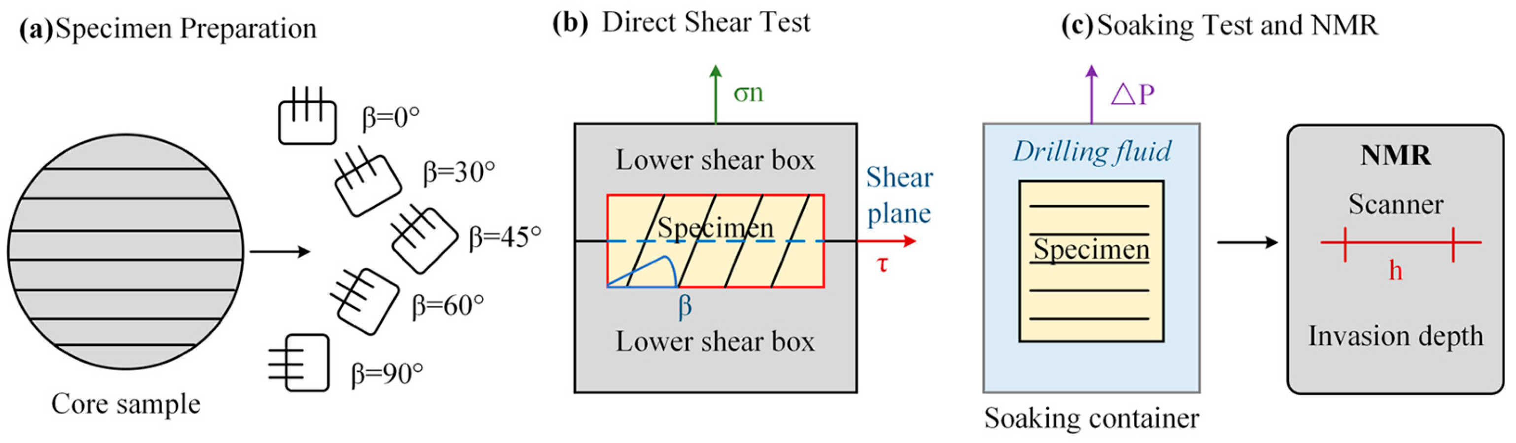 Schematic of the experimental setup. (a) Sample preparation methods for specimens with different bedding angles. (b) Direct shear testing apparatus and loading method. (c) Soaking test and NMR penetration depth measurement system.