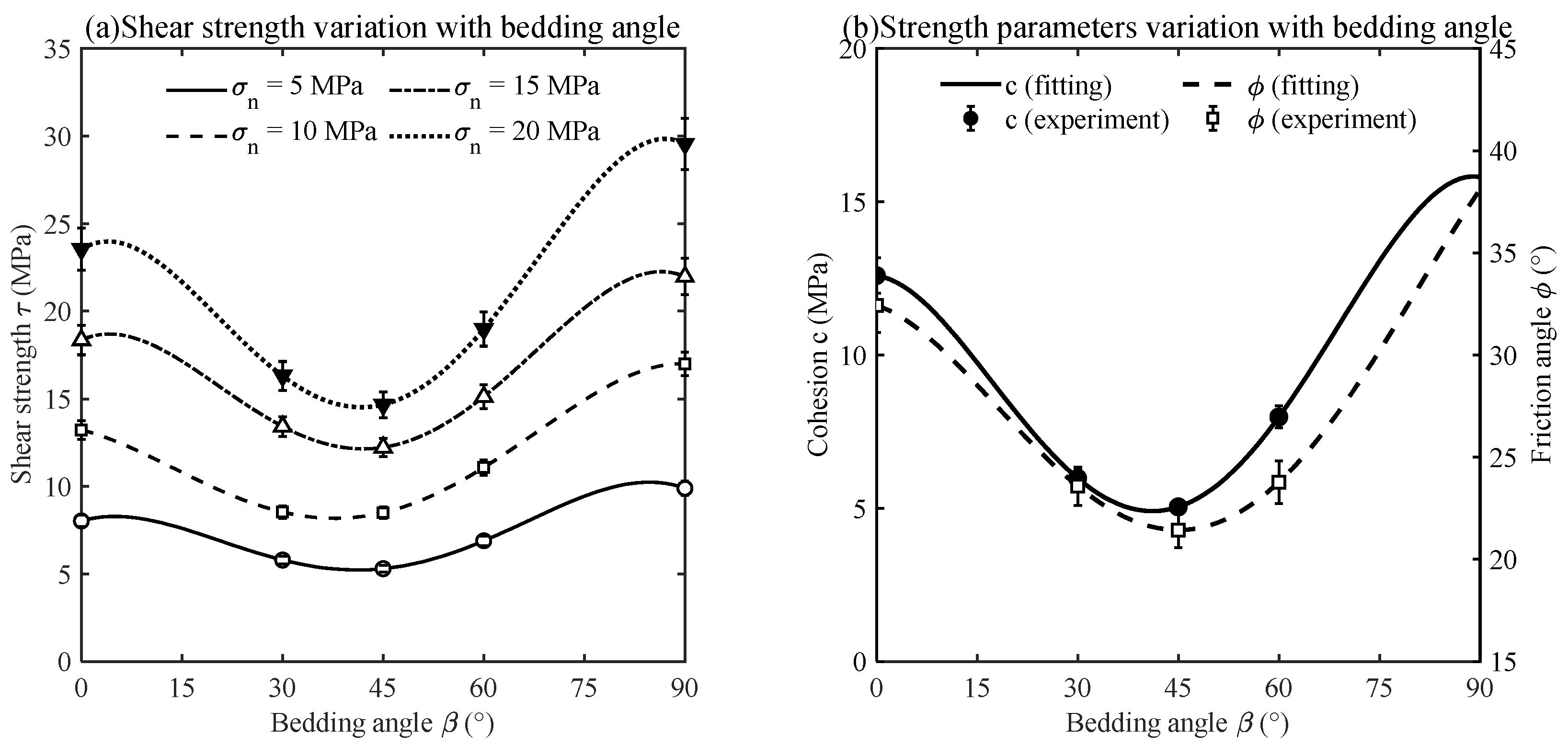 Figure 4 shows the strength characteristics of Longmaxi Formation shale at different bedding angles. In Figure 4a, when the normal stress is between 5 and 20 MPa, shear strength follows a clear U-shaped pattern based on the bedding angle β. When the bedding angle is β = 45°, the shear strength hits its lowest point of 11.4 MPa at σn = 15 MPa. In contrast, at β = 0° and β = 90°, the shear strength is 23.0 MPa for both angles, showing that the minimum strength is about 50% of the maximum strength. As the normal stress goes up from 5 MPa to 20 MPa, shear strength shows a steady increase at all angles, but the U-shaped pattern stays the same. At β = 45°, shear strength went up from 5.1 MPa to 14.7 MPa, while at β = 90°, it rose from 10.3 MPa to 29.2 MPa. The experimental data points matched the fitted curves well, with the standard deviation for each test group being less than 5%, showing that the test results are reliable.