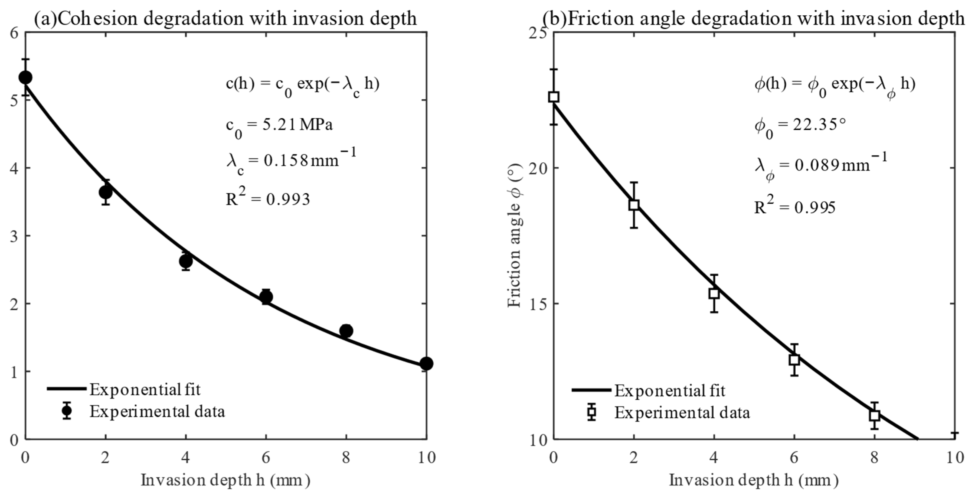 Strength degradation with invasion depth: (a) cohesion degradation with exponential fitting; (b) friction angle degradation with exponential fitting.