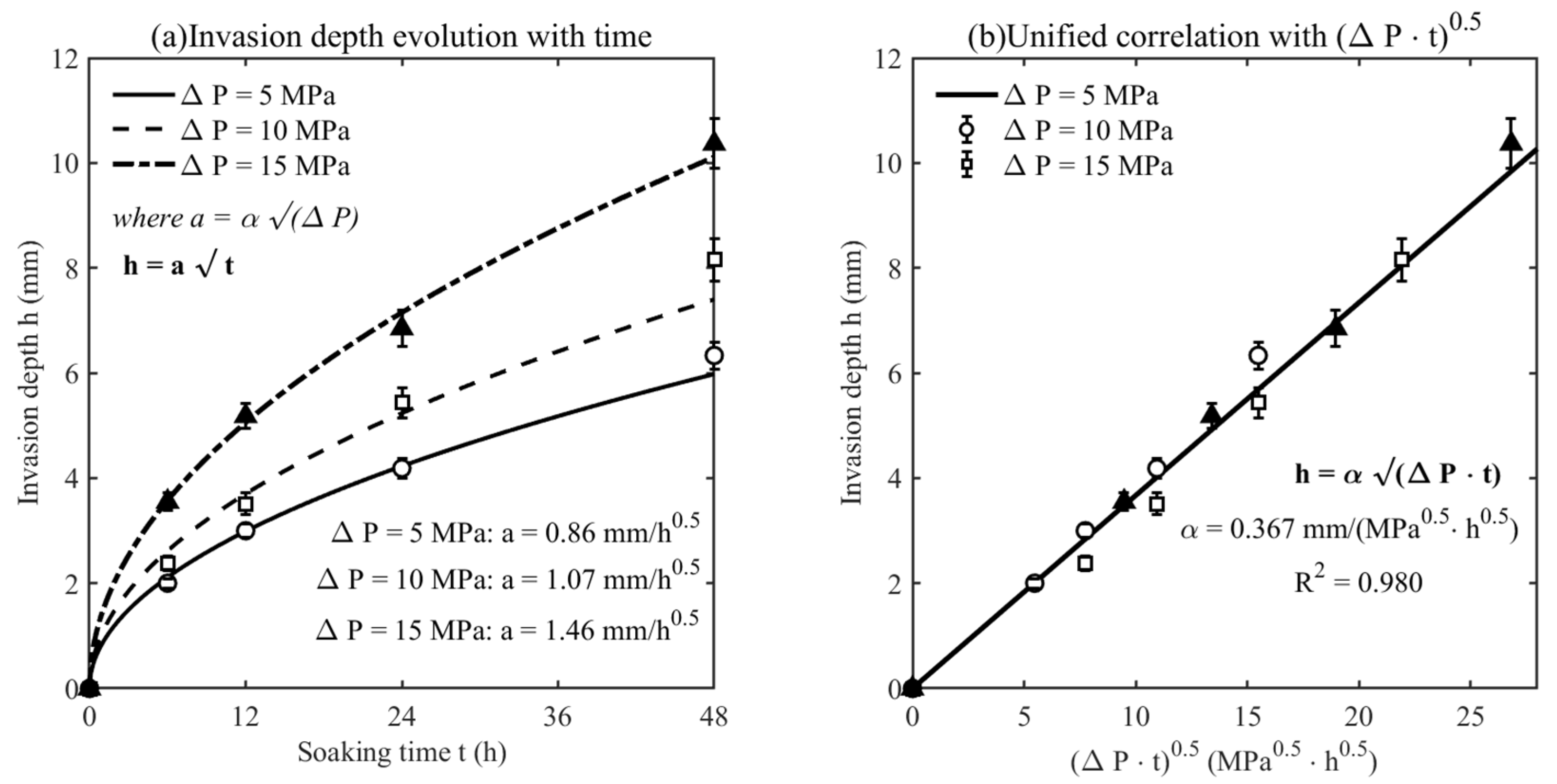 Invasion depth evolution: (a) invasion depth versus soaking time under different pressure differentials; (b) unified correlation between invasion depth and √(ΔP·t).
