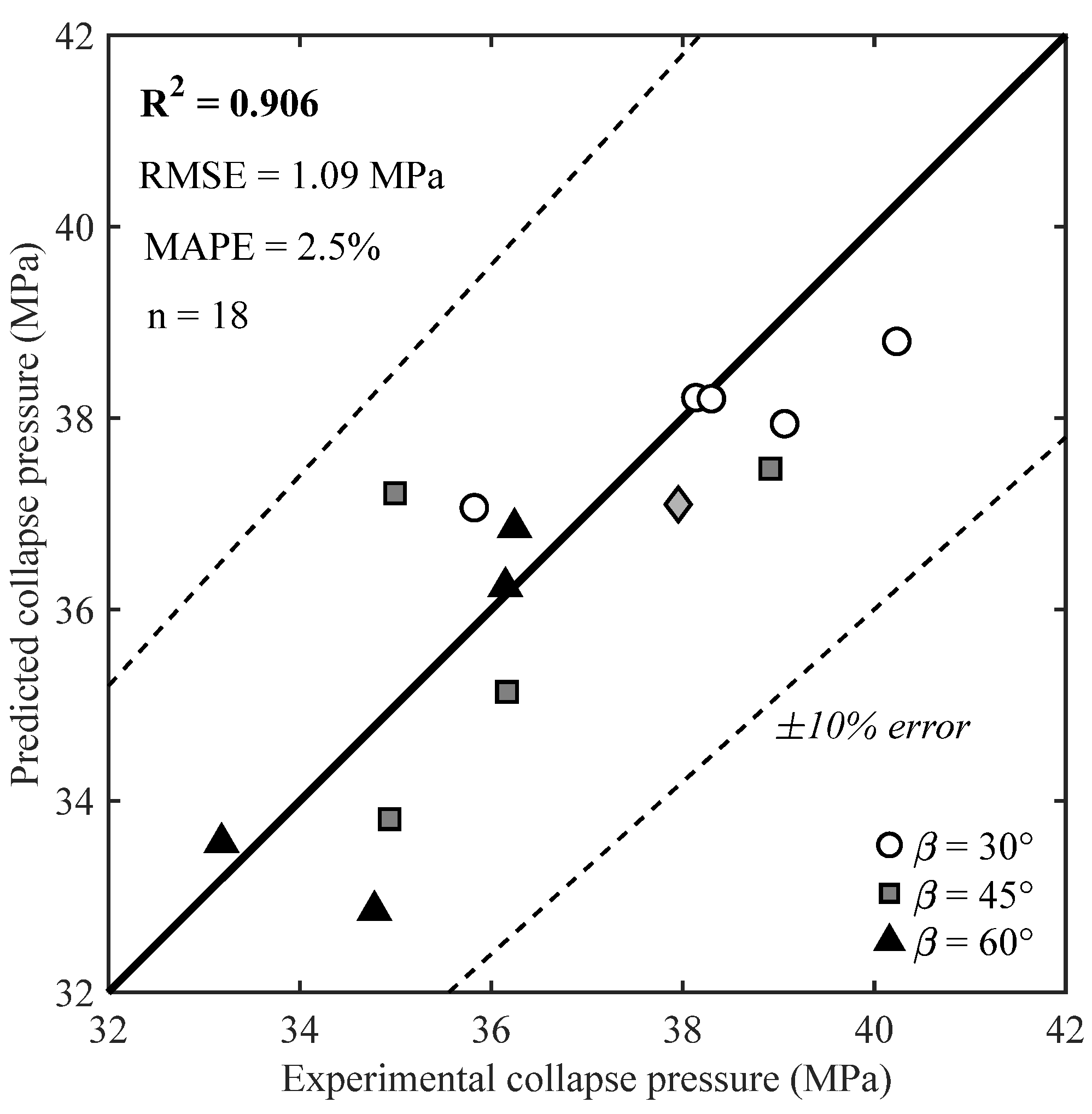 Comparison between predicted and experimental collapse pressures. Data points represent different bedding angles (β = 30°, 45°, 60°) under varying invasion depths (h = 0–10 mm). The solid line indicates perfect agreement (y = x), and dashed lines show ±10% error bounds.