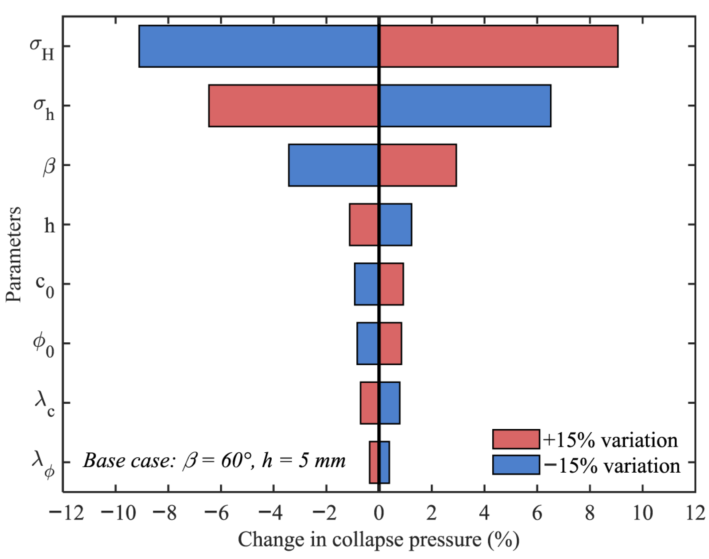 Tornado diagram showing sensitivity analysis of collapse pressure to model parameters under ±15% variation (base case: β = 60°; h = 5 mm).