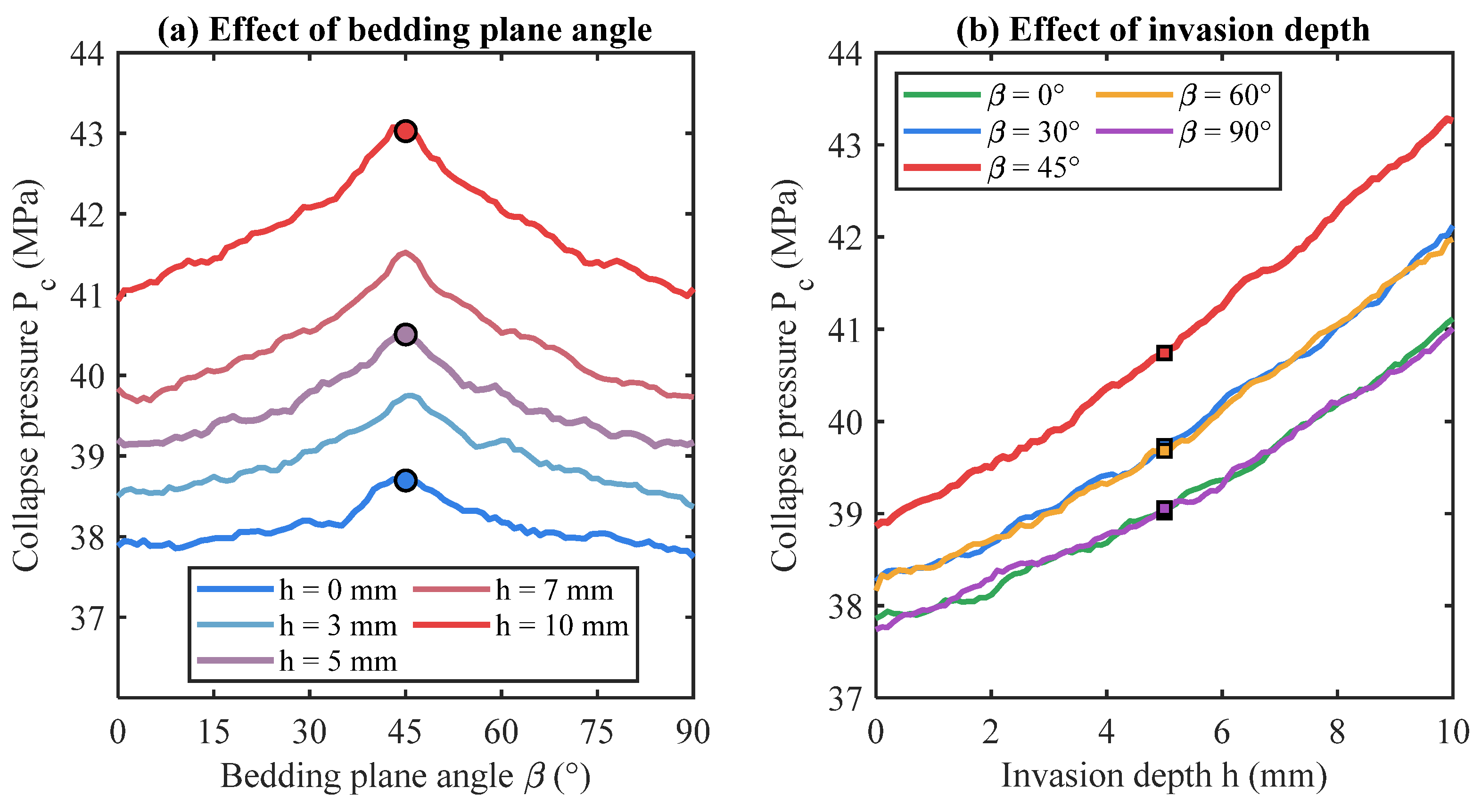 Figure 9 shows how bedding angle and intrusion depth affect collapse pressure. Figure 9a reveals that collapse pressure forms a typical upside-down U shape based on the bedding angle, reaching its highest point at β = 45° and increasing by about 5–8% compared to β = 0° or 90°. This pattern matches the strength differences shown in Figure 4: the lowest shear strength at the bedding plane occurs at β = 45°, making the wellbore more likely to experience slip failure, so it needs higher mud pressure to stay stable. Importantly, the upside-down U-shaped pattern remains the same across all intrusion depths, showing that the effects of anisotropy are strong throughout the whole intrusion process. Figure 9b shows that collapse pressure increases steadily as intrusion depth increases. As intrusion depth grows from 0 to 10 mm, collapse pressure goes up by about 7–8%. The red curve for β = 45° is always the highest, being about 2–3 MPa greater than the other angles. This shows the combined impact of anisotropy weakening and intrusion damage. The nearly parallel spacing between the curves suggests that, within the parameters studied here, the two effects add together instead of multiplying. This feature helps simplify engineering calculations.