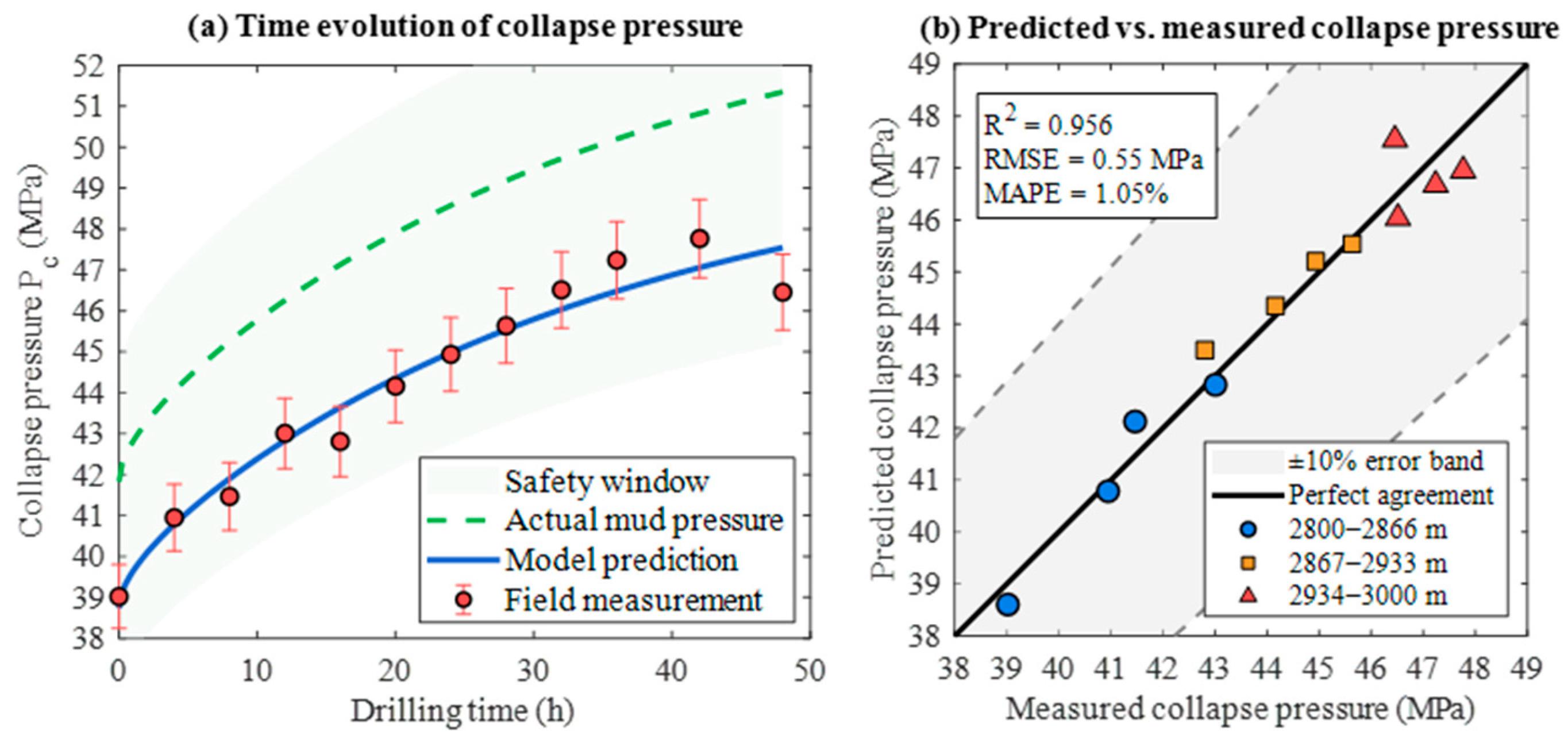 Field validation of collapse pressure prediction: (a) time evolution of collapse pressure with model predictions and field measurements; (b) predicted versus measured collapse pressure for 12 field data points (R2 = 0.956; RMSE = 0.55 MPa).
