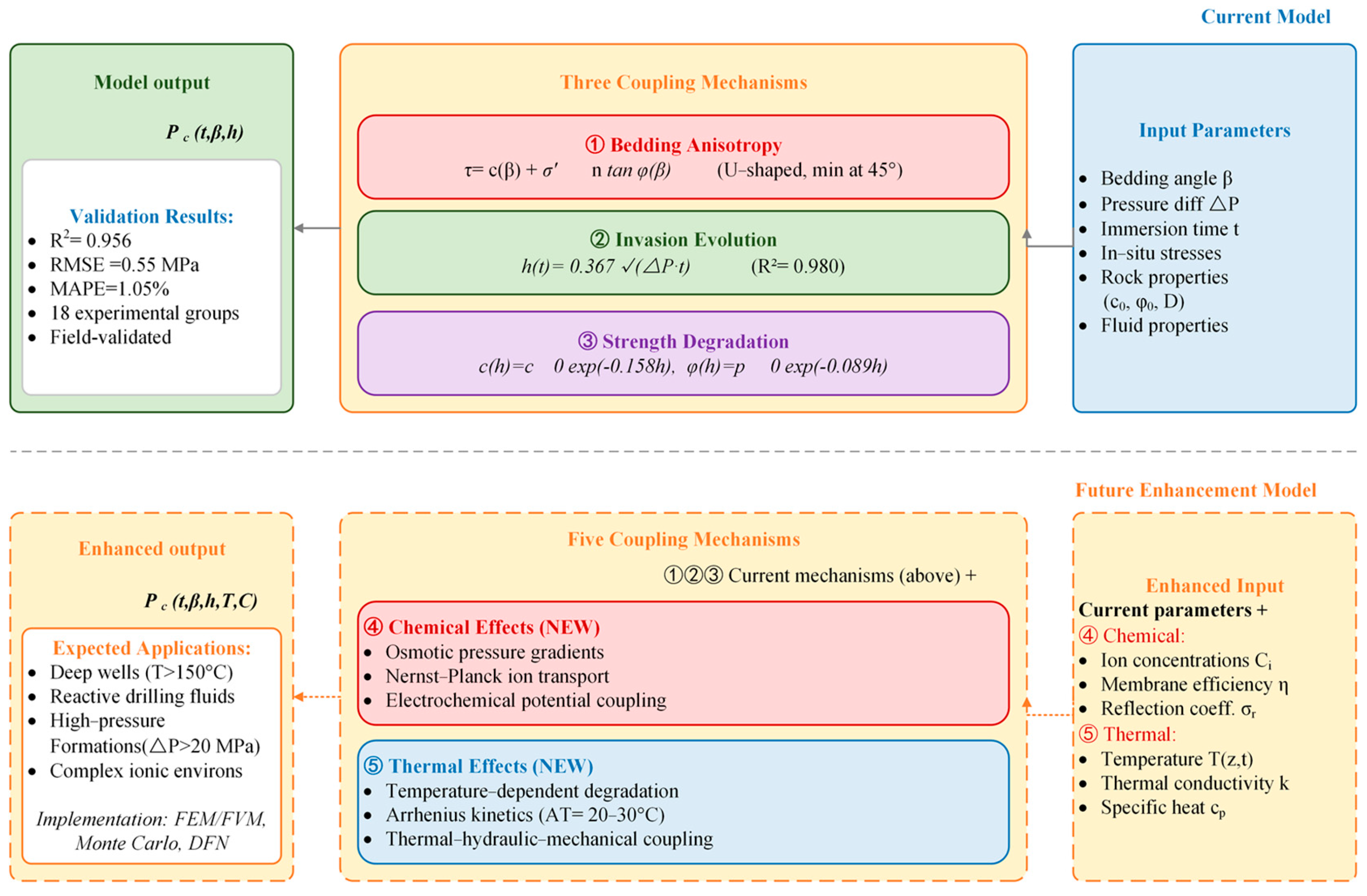 Figure 11 summarizes the conceptual framework of this coupled model. As illustrated, the current model integrates three coupling mechanisms—bedding anisotropy, invasion evolution (h = 0.367√(ΔP·t)), and strength degradation—to predict time-varying collapse pressure Pc(t, β, h) with excellent validation (R2 = 0.956; MAPE = 1.05%). The lower panel illustrates future enhancement pathways by incorporating chemical effects (osmotic pressure and ion transport) and thermal effects (temperature-dependent degradation and Arrhenius kinetics) to expand model applicability to deep wells and reactive fluid environments.