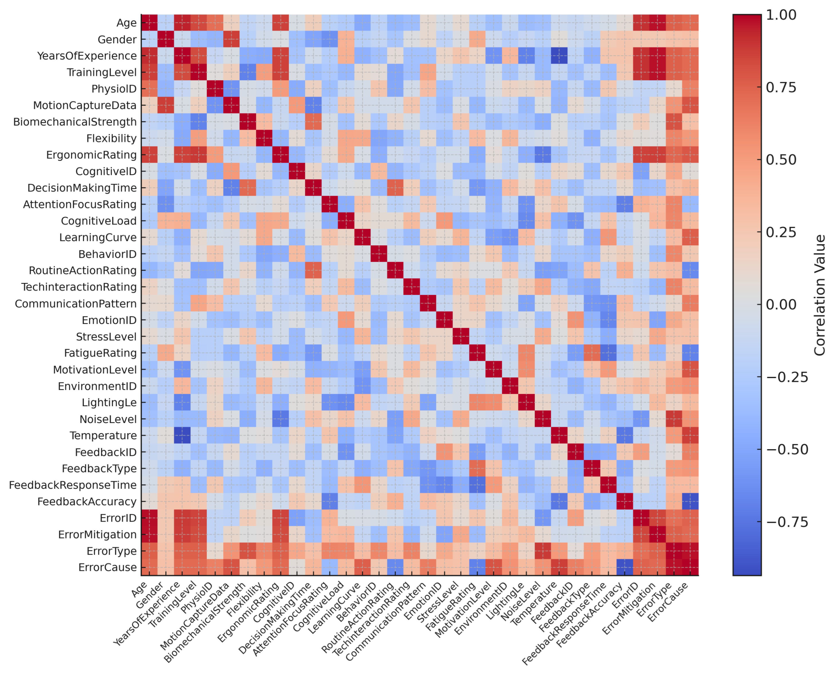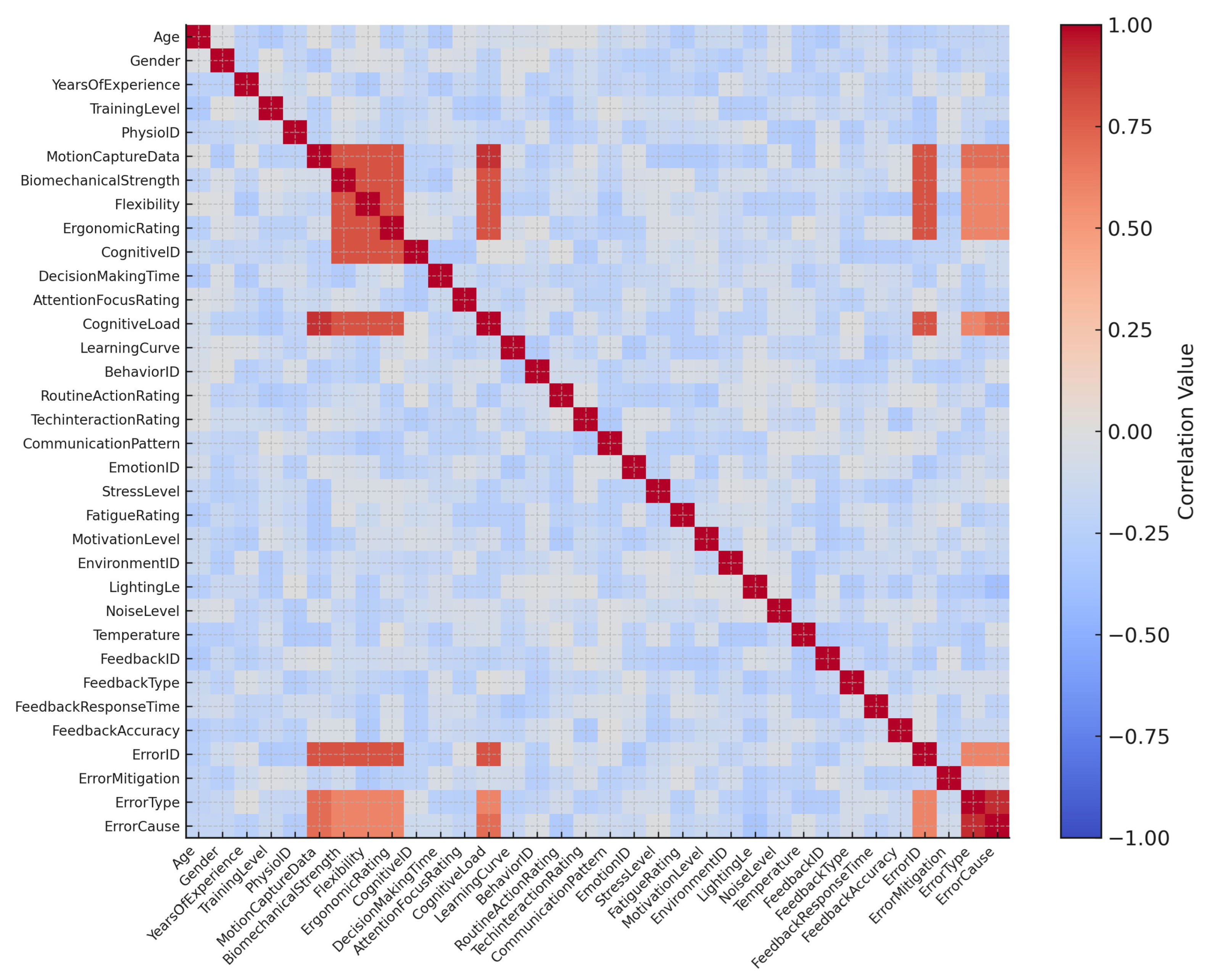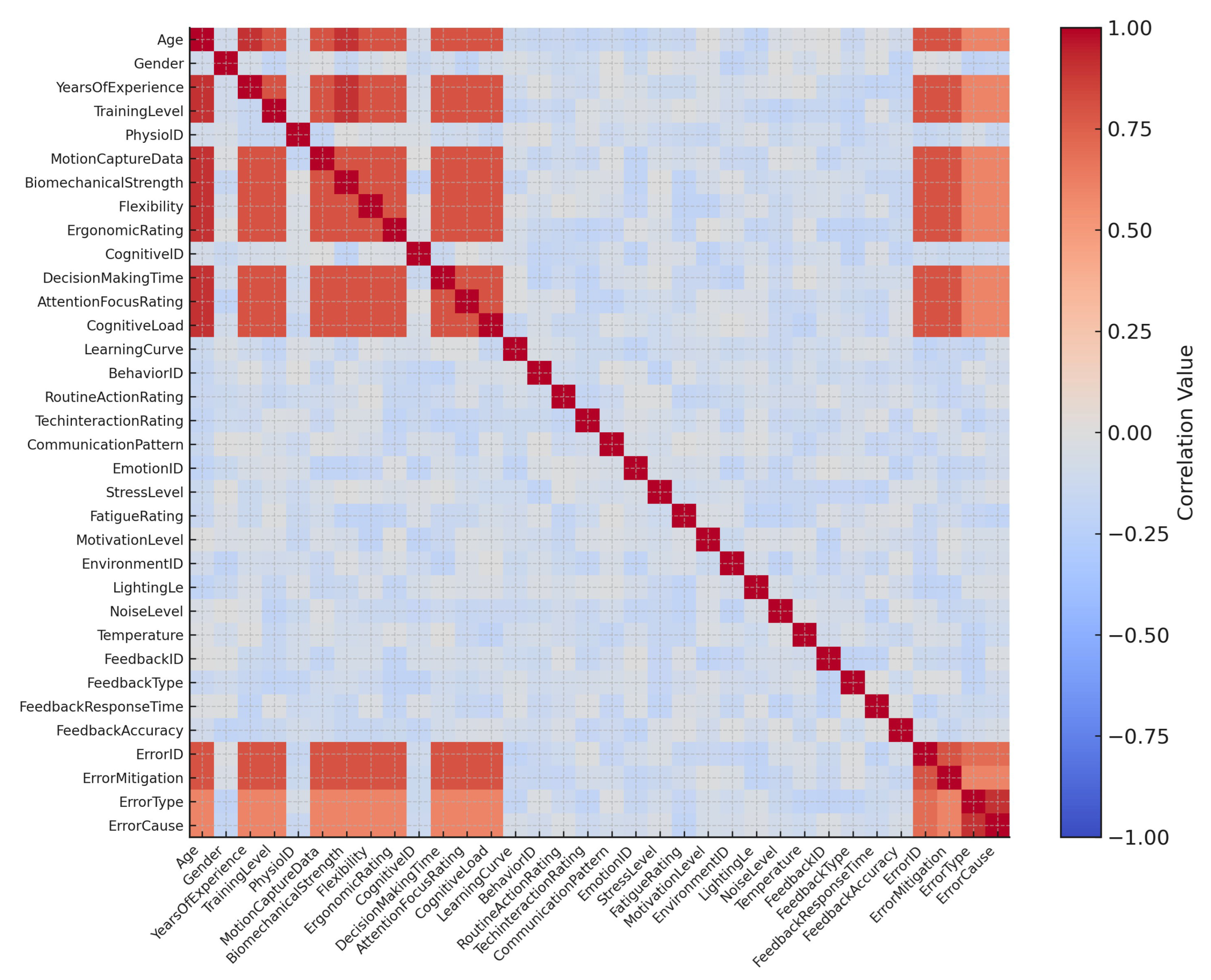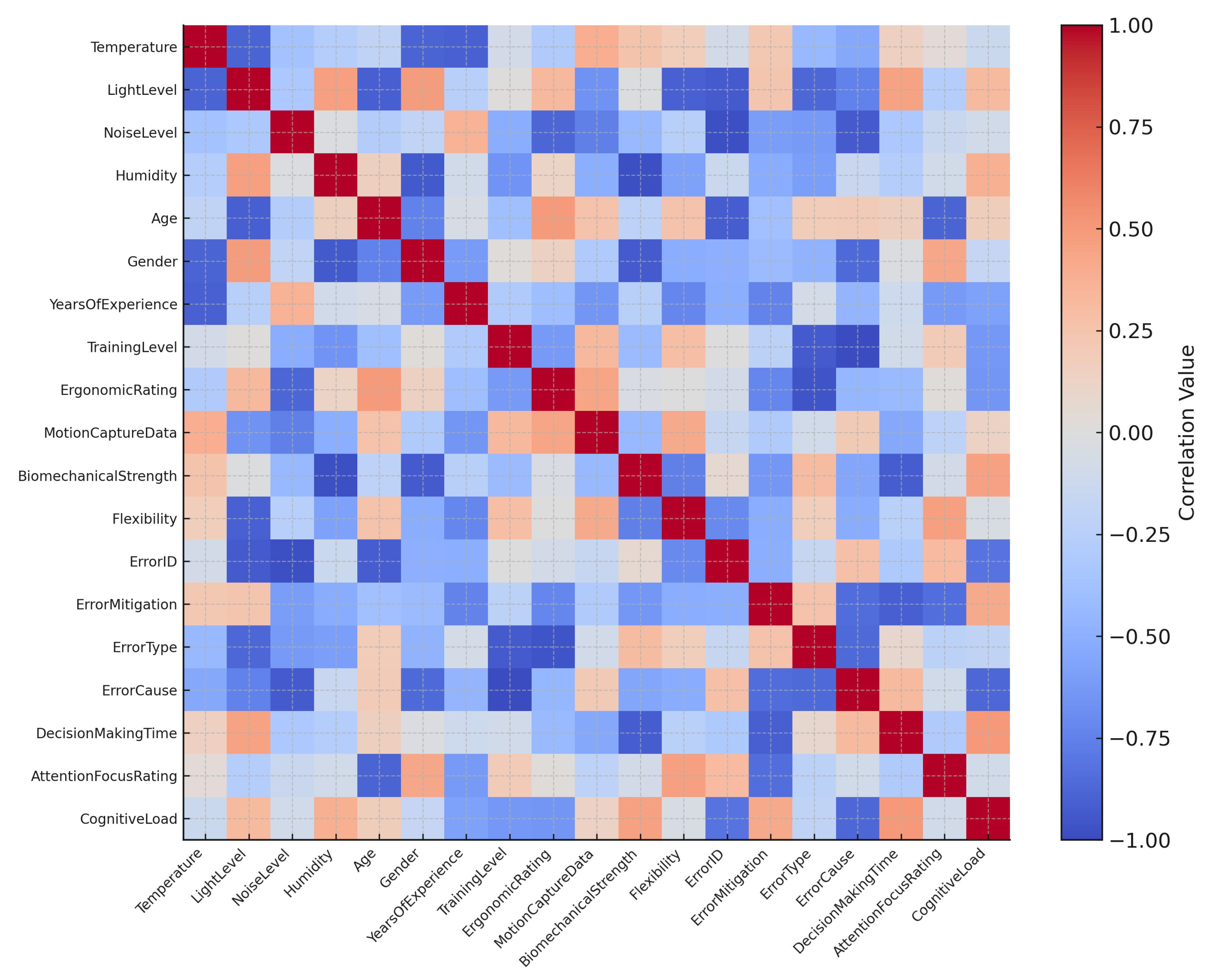 - Errors vs. System Metrics: Associations between system metrics Error ID and Error Mitigation are comparatively weaker, suggesting that error management also depends on procedural, cognitive, or organizational factors beyond physical/ergonomic characteristics.