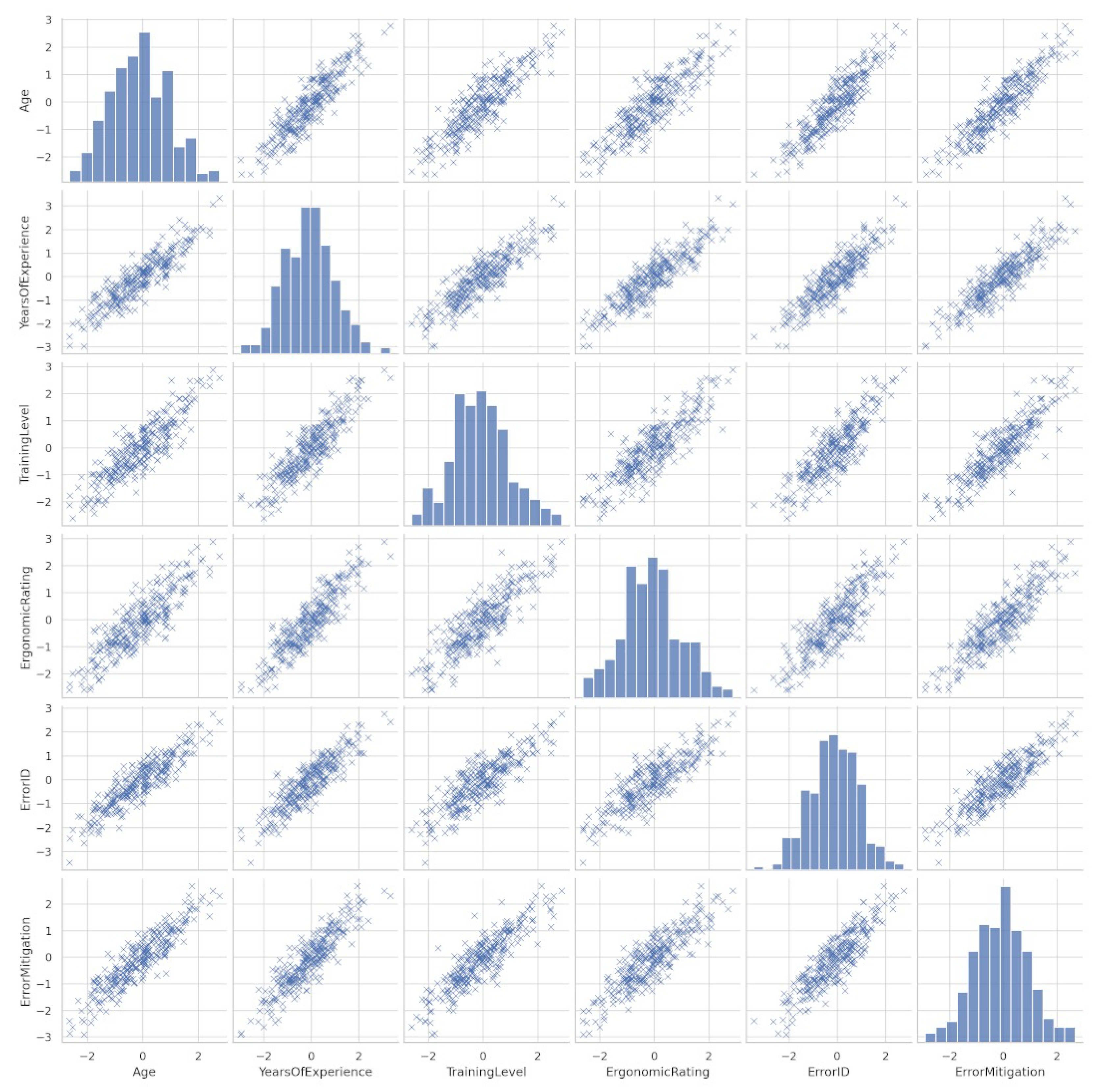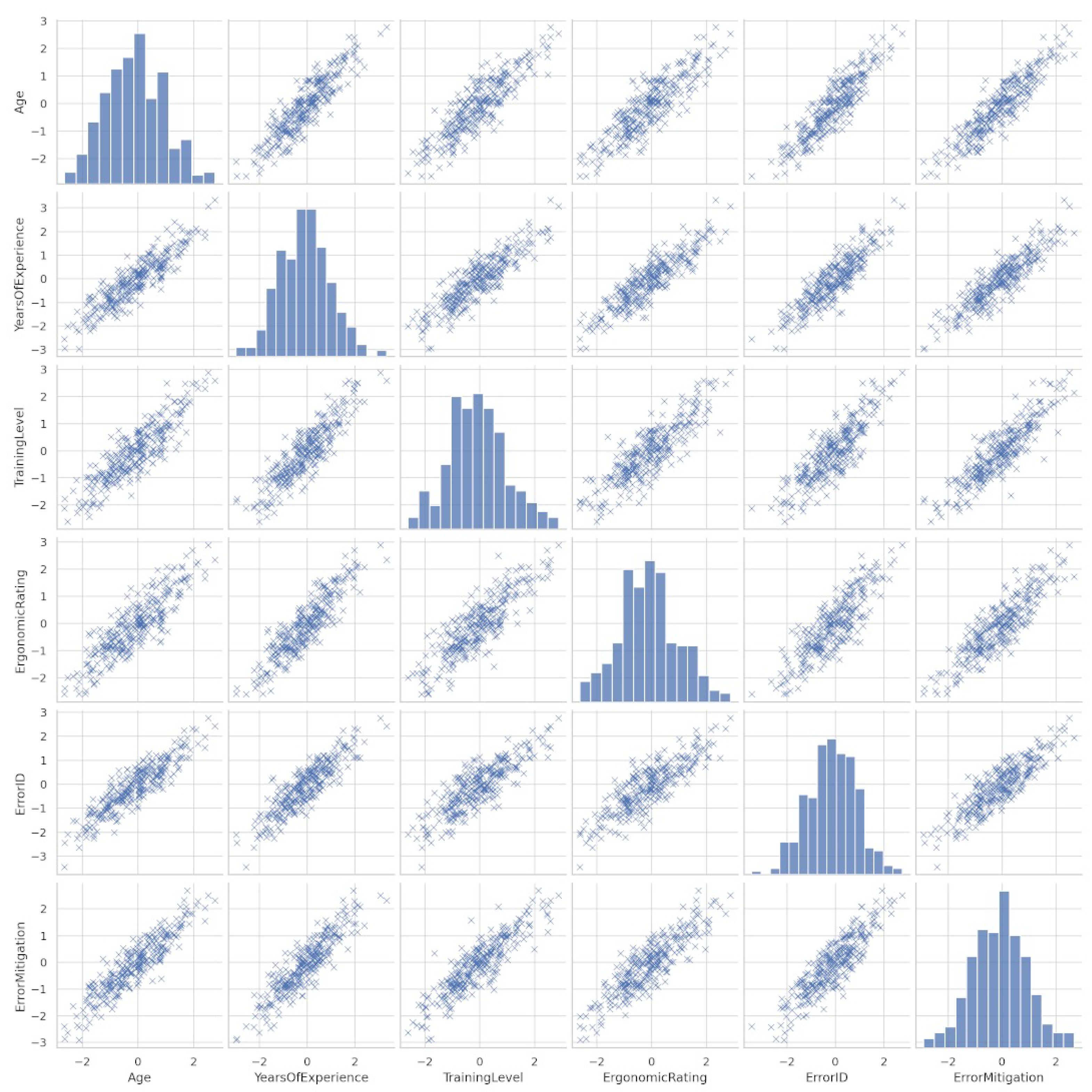 - Distributional Notes: Core variables (Age, Years Of Experience, Training Level, Ergonomic Rating, Error ID, Error Mitigation) show approximately normal distributions (cf. pair plot diagonals).