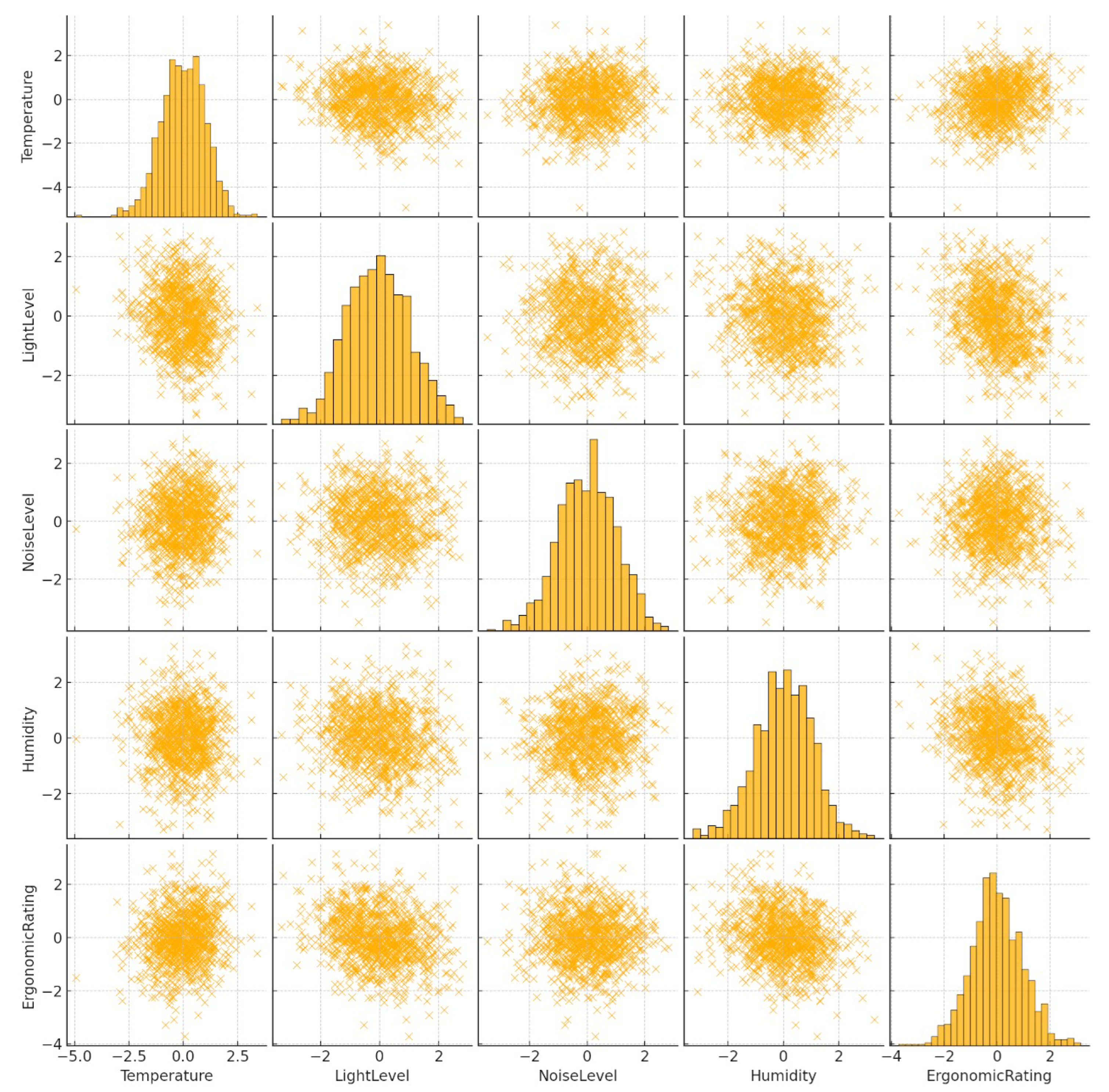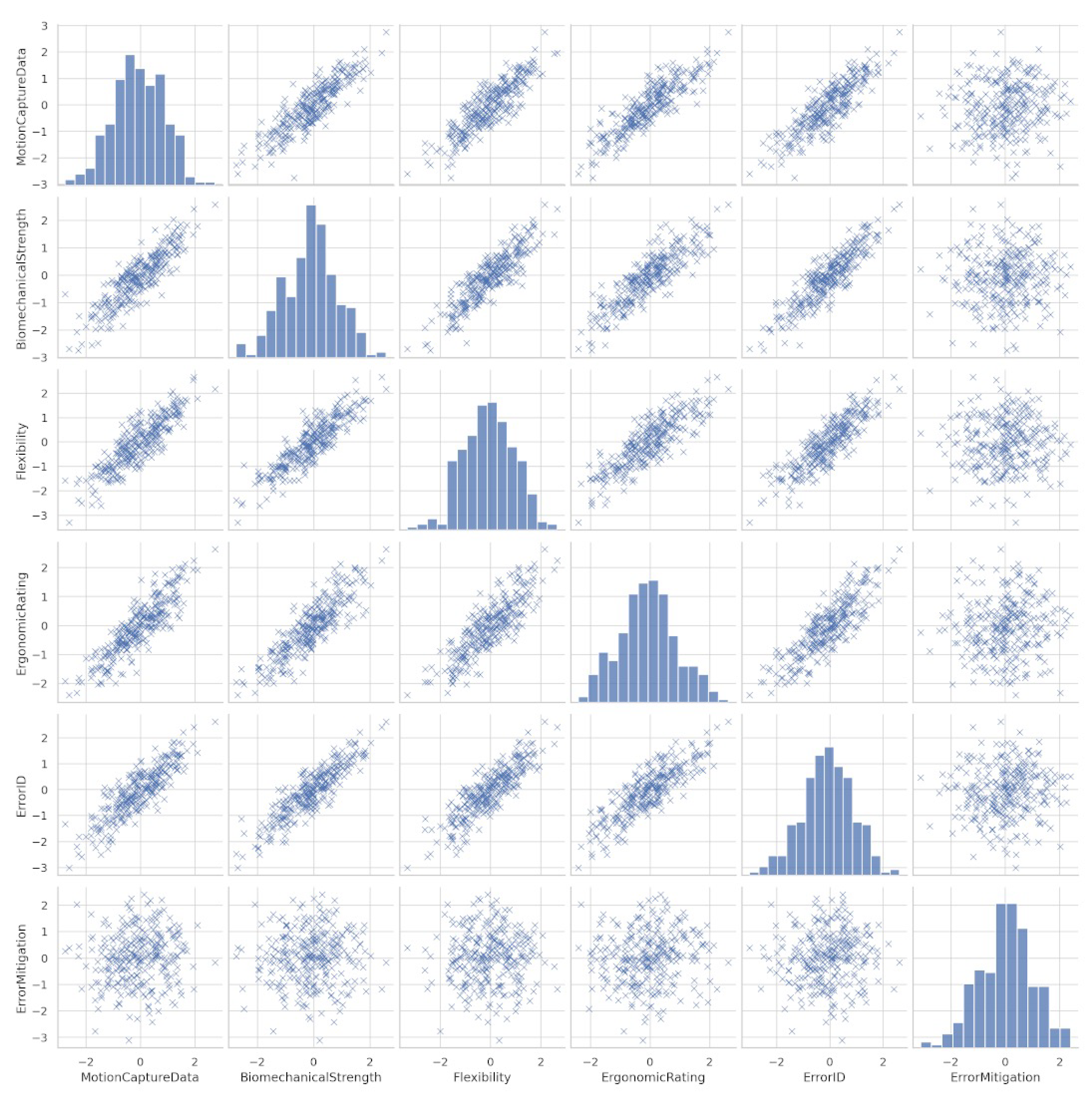 - Distributional Notes: System variables (e.g., Motion Capture Data, Biomechanical Strength, Flexibility, Ergonomic Rating, Error ID, Error Mitigation) show approximately normal distributions (cf. pair plot diagonals).