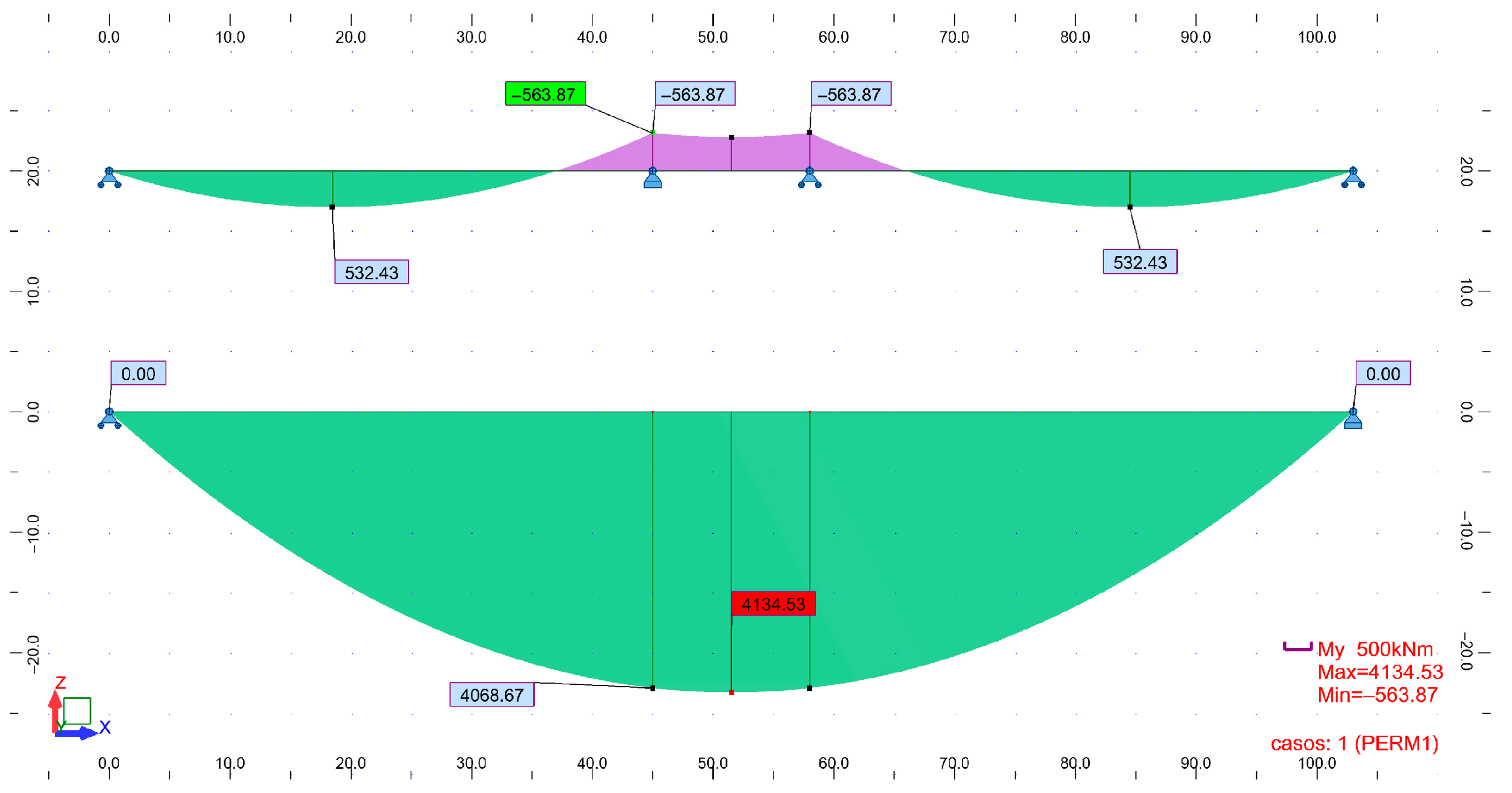 Table 1, it should be noted that the calculations contain small approximations that do not diminish the validity of the comparison. The analysis assumes a unit beam width; thus, any increase in width would proportionally increase the calculated values. A unit load condition is also considered, meaning that higher loads would scale the results accordingly. However, the self-weight of the steel structure would naturally be greater in the first configuration than in the second, thereby accentuating the differences and further improving the efficiency of the shorter-span solution. Regarding the differences shown in the last column, the 45 m beam configuration reduces the bending moment by approximately 81 percent compared to the 103 m beam configuration, the required moment of inertia by 97 percent, and the indicative structural depth by 66 percent. As steel cost is derived from these parameters, the design can be considered appropriate if the final steel weight remains within a reasonable range—typically between 30 and 80 kg/m