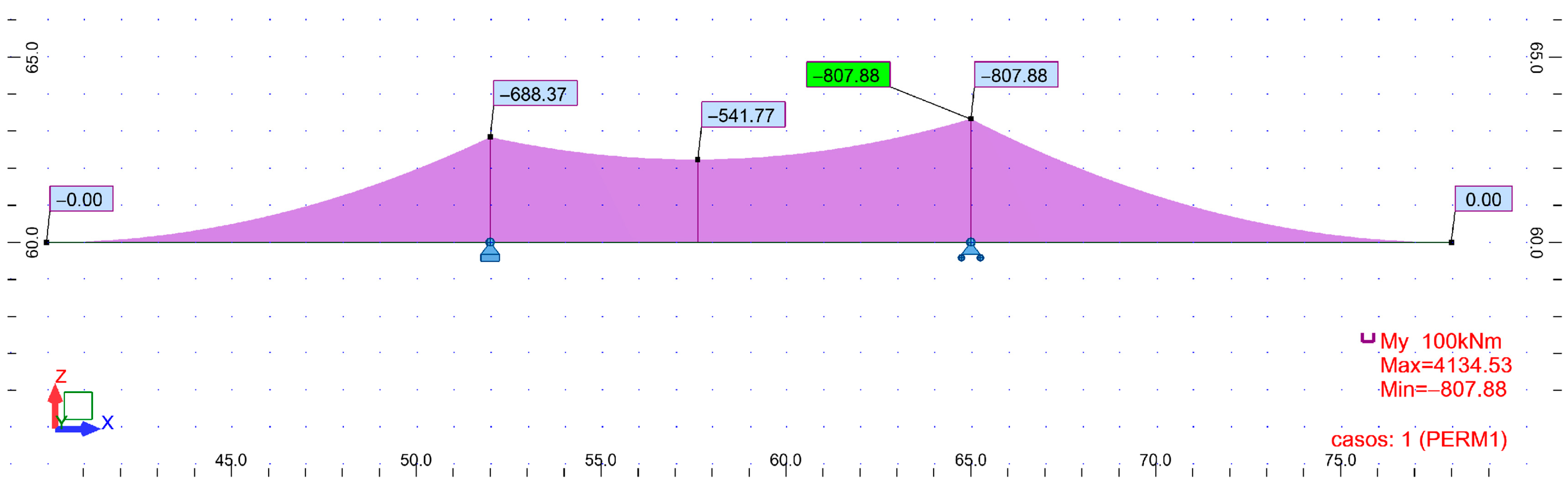 Figure 2, prevents the negative moment from reversing at the hall’s midpoint. Therefore, comparing a 103 m simply supported beam with a 45 m span pinned–fixed beam produces the results summarized in