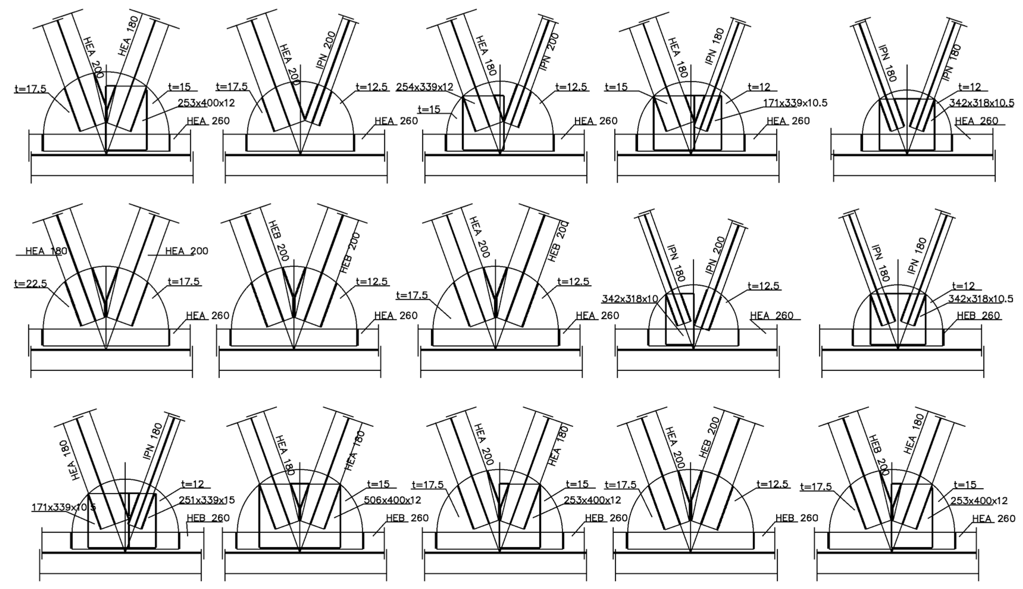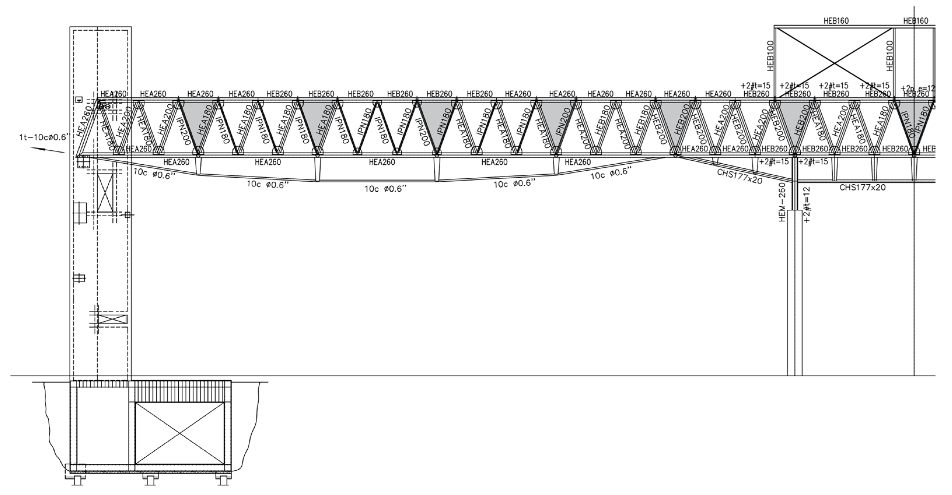 Diagonal Chord Connections in the Main Frames. The truss girder was designed with HEA, HEB, or HEM-300 chords. With some spans exceeding 30 m during the lifting phase, the beams could experience excessive vibrations or even failure due to their low transverse stiffness. To prevent this phenomenon, the HEBs were arranged with the web horizontally and with the flanges vertically. This configuration increased the transverse stiffness of the flat beam and also facilitated the bolted connections of the transverse frames. The diagonals were also positioned with the vertical flanges. To facilitate the connections, HEB, IPE, or IPN profiles with depths of 300, 260, or 240 mm were used. This profile catalogue allowed the tension diagonals to be smaller than the compressed diagonals with lower axial forces, and enabled the elevation to represent shear forces at any point along the beam, even distinguishing between compression and tension in consecutive diagonals [