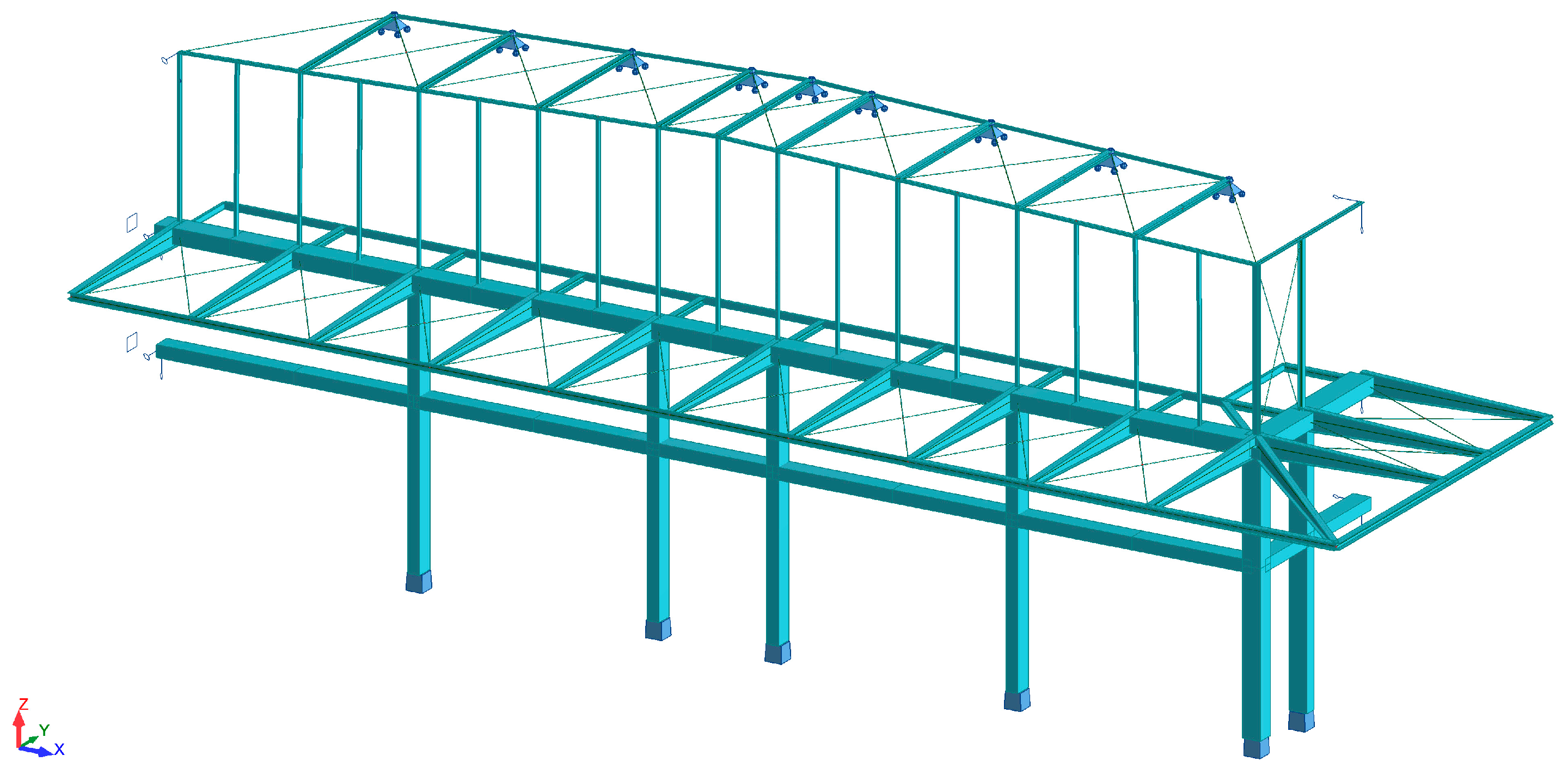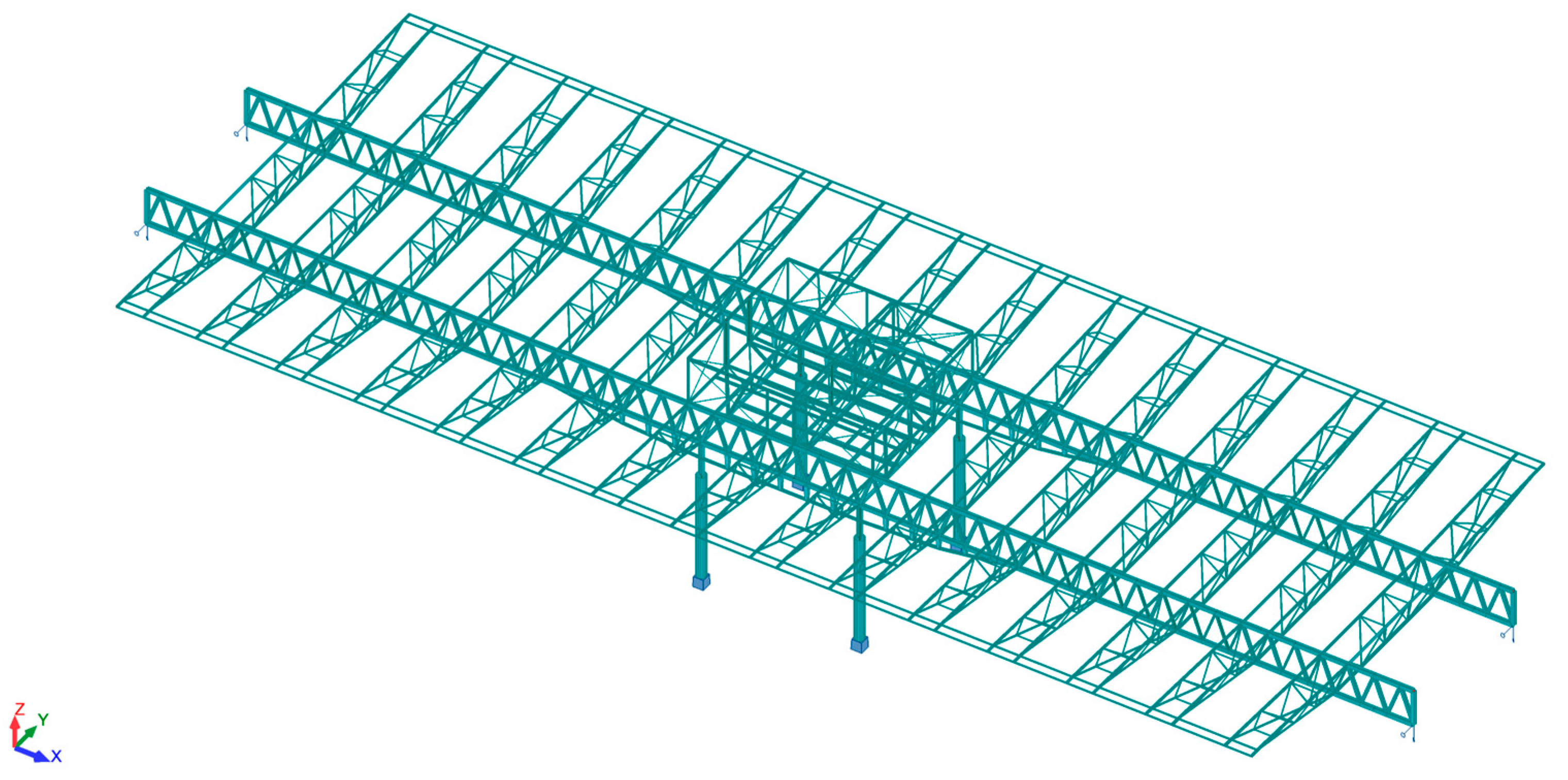 Main Hall. A 3D bar model was developed to perform structural calculations. In 1999, computers and software were far less capable than they would become just a decade later. The images attached to this article were imported into Autodesk Robot 2024 [