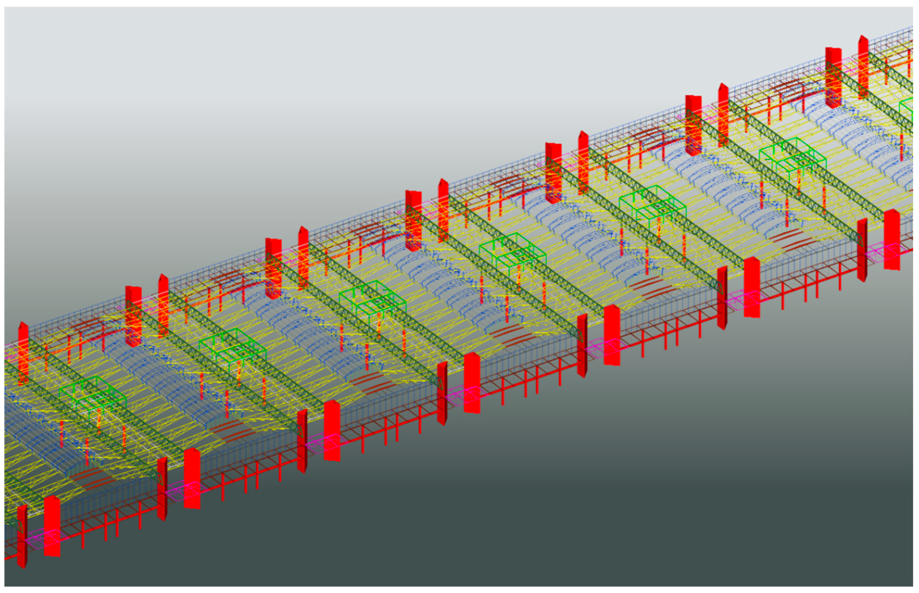 31], selected because it provides a more architecturally expressive form than other common truss types such as Pratt or Howe, which are frequently used in industrial buildings. For the transverse frames, a lighter Warren girder was also adopted, repeated at every third triangle of the longitudinal frame’s filler bars. This approach is further justified by the limitation that the roof sheets could span no more than 5 m.