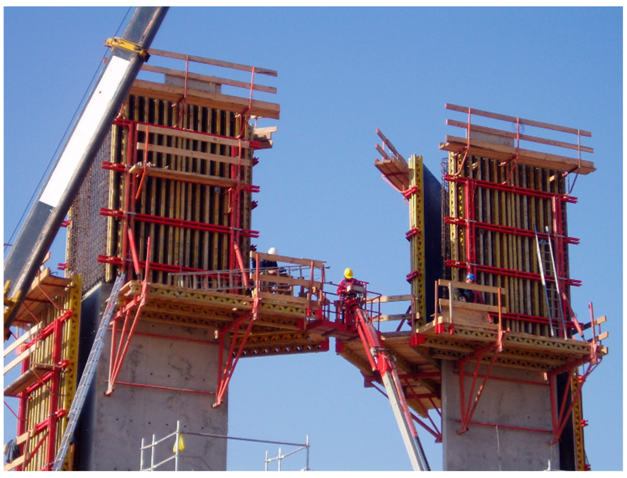 Concrete Pillars. The concrete pillars were poured in a single operation to avoid a two-stage process. To achieve this, the formwork was braced with guy wires and props at two heights, and the concrete was poured using a hopper to prevent material collapse from significant heights. A plate was placed at the top of each pillar to facilitate bolted connections with the uprights of the main longitudinal frame.
