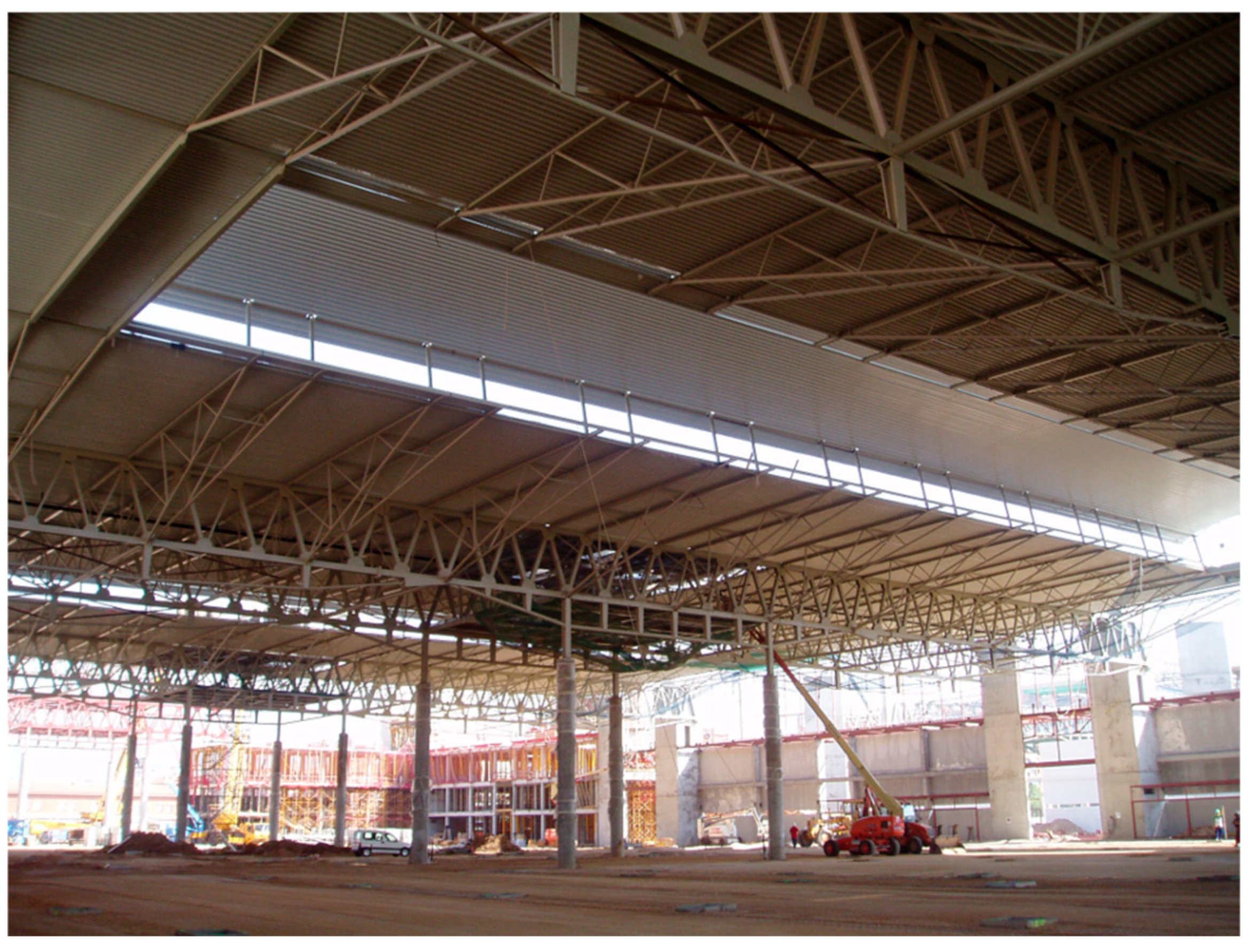 36]. This decision was ultimately discarded to avoid interrupting the roof at the nave’s center, which could have caused water infiltration. It should be noted that each longitudinal frame supports a tributary width of 24.5 m, which also justifies the increase in depth from 3 m to 4.5 m.