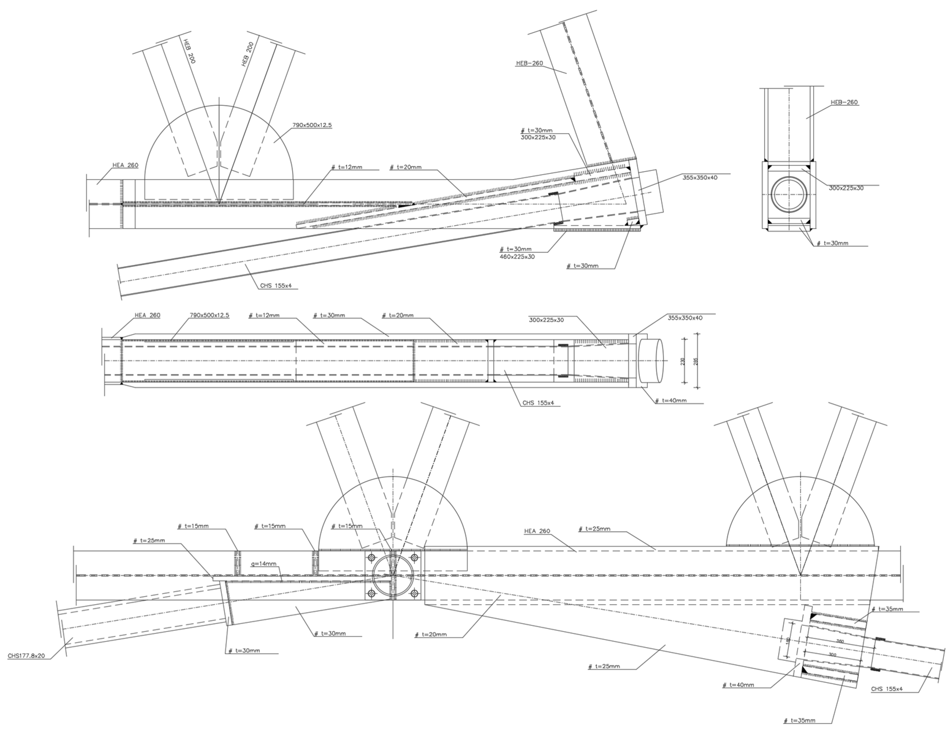 The junction details were slightly more complex, with approximately fifteen different cases. At the junctions, a half-circle design was adopted to emphasize that the space was not an industrial warehouse but closer to a salon. This was achieved using a transition plate, which, in some cases, acted as a bridge to accommodate welds between plates of significantly different thicknesses, or where the diagonal was thinner than the interior width of the HEB. A lattice girder requires larger chords in the center and smaller chords at the ends, while the diagonals follow the opposite pattern—larger at the ends and smaller in the center. The corresponding details are illustrated in