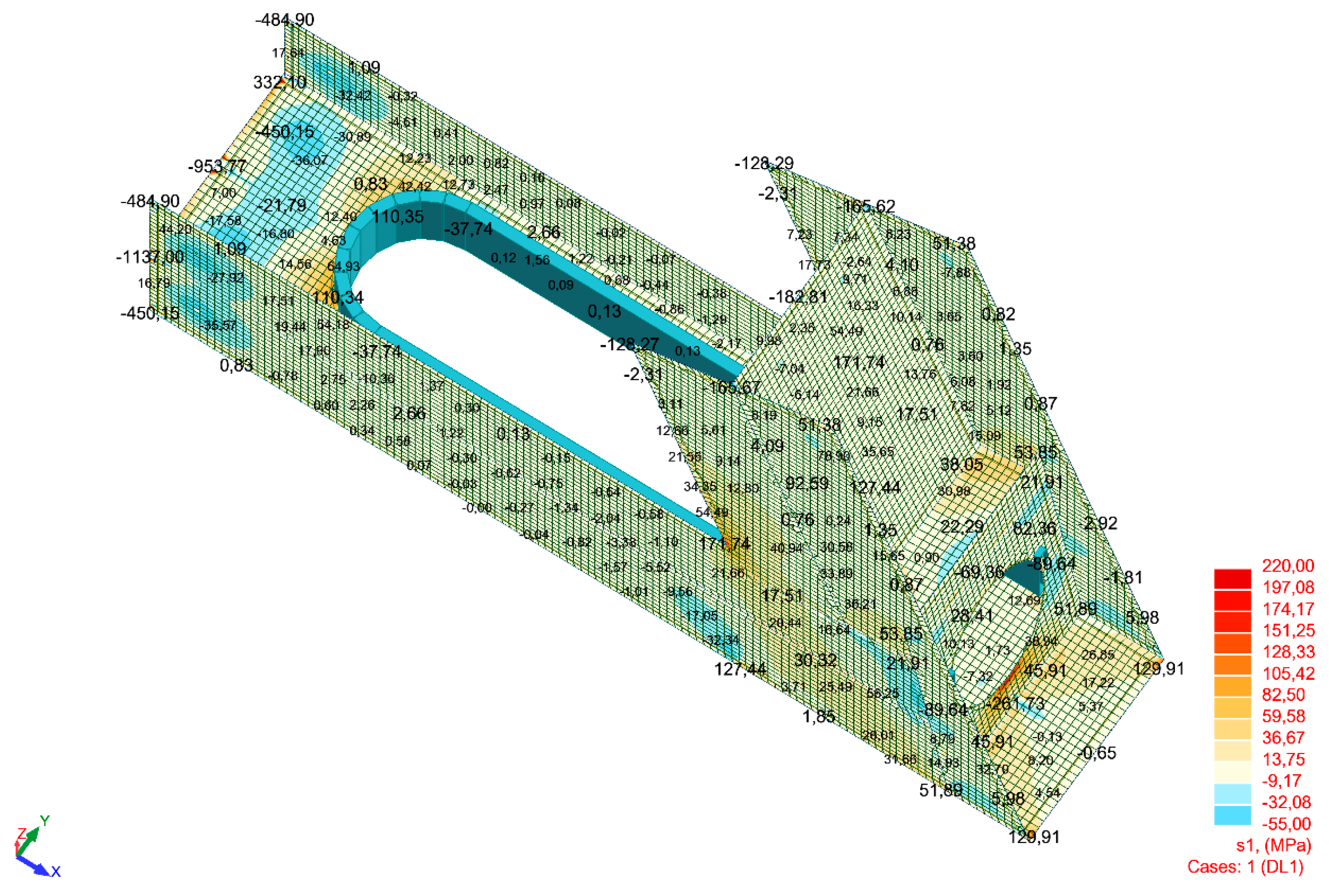 Anchor Plate Between the Ventilation Core and the Longitudinal Frame. Since the core was built using sliding formwork, it was necessary to design a plate that could be supported by both the reinforcement and the formwork, while remaining flush with the wall face. This plate transmits 1500 kN to the concrete and, due to the beam’s eccentricity relative to the wall, generates a moment of 225 kNm in the SLS. To control shear, the plate was internally reinforced with two IPN profiles, each capable of independently transferring this vertical load. Studs with threaded heads and legs were also installed to transmit the moment to the supporting structure. After the formwork was removed, an unpainted steel plate remained, serving as the base for a welded metal bracket. This bracket rested on a smaller plate, which was welded around its entire perimeter to the plate left on the wall. The bracket caused tension in its upper portion and compression in its lower portion, with shear transmitted through the two vertical welds. However, these welds were too long to effectively resist the resulting stresses. Due to the challenges of executing the weld on-site and the considerable effort required, slots were provided in the upper portion to reinforce the tensioned area, thereby increasing the effective weld length. If the weld presented uncontrolled defects, this excess would protect the most critical area of the joint, as the compressed weld would still transfer load through direct contact between the two elements. The detail is illustrated in
