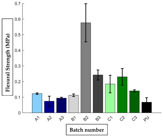 The figure shows the average flexural strength values (MPa) obtained for the different experimental groups (A1, A2, A3, B1, B2, B3, C1, C2, C3, and PU). In general, the values range between 0.07 and 0.58 MPa. It noteworthy that these low values, when compared with the literature for structural composites, are consistent with the low apparent density of the material. This suggests an application primarily in the field of thermal insulation rather than load-bearing structures.
