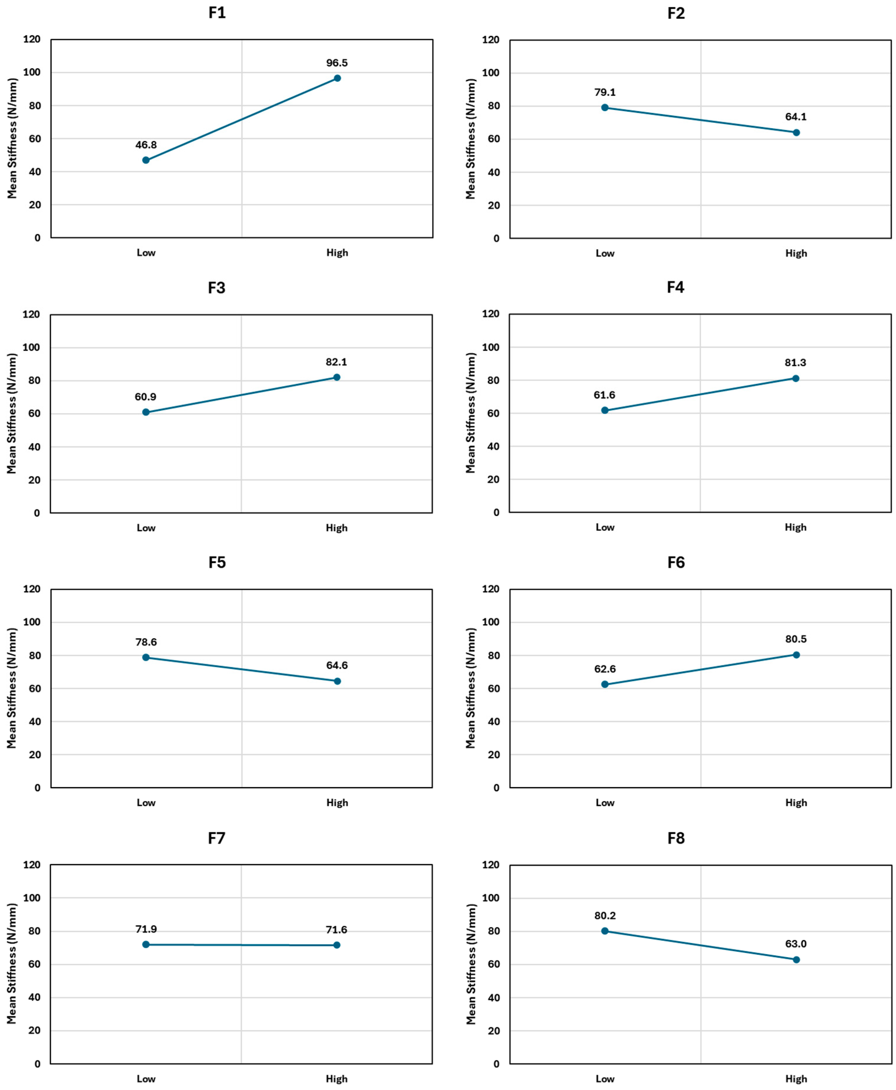 3.1. Stiffness Results from the Taguchi Inner–Outer Array