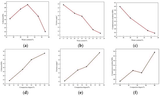 Variations in red clay mechanical parameters with water content and degree of compaction. (a) (variation curve of cohesion with water content): It depicts that cohesion first increases and then decreases as water content rises; (b) (variation curve of friction angle with water content): It shows that friction angle decreases gradually with increasing water content; (c) (variation curve of compression modulus with water content): It illustrates that compression modulus decreases continuously as water content increases; (d) (variation curve of cohesion with compaction degree): It reflects that cohesion increases with the rise of compaction degree; (e) (variation curve of friction angle with compaction degree): It shows that friction angle increases gradually as compaction degree rises; (f) (variation curve of compression modulus with compaction degree): It demonstrates that compression modulus increases overall with the rise of compaction degree (with a slight fluctuation in the middle).