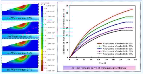 Contour maps of vertical displacement and time-response curves of settlement for embankments with different filler water contents.