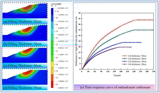 Contour maps of vertical displacement and time-response curves of settlement for embankments with different lift thicknesses.