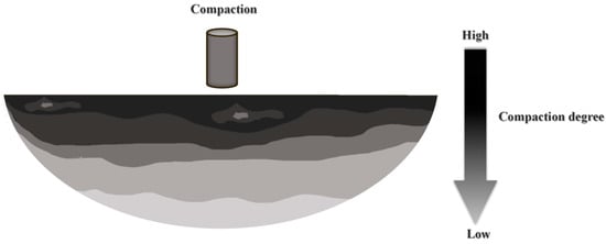 The influence of layered filling thickness on settlement is also closely related to the compaction degree of soil. When the filling thickness is large, it is difficult for the construction equipment to effectively compact the deep filler, resulting in a decrease in the compaction degree. Insufficient compaction will increase the void ratio of the filler and make the soil more prone to compression deformation, which is consistent with Olinic et al.’s [49] finding that the inadequate compaction of problematic clayey fills fails to mitigate their inherent deformation risks. Song et al. [50] introduced the resistivity method into the evaluation of soil compaction degree and obtained the distribution of compaction degree in the region: the general rule is that the compaction degree decreases with the increase in soil depth, and the simplified diagram is shown in Figure 11. This depth-dependent DC distribution aligns with the numerical simulation results of this study, further verifying that excessive lift thickness leads to insufficient deep compaction and increased settlement potential.