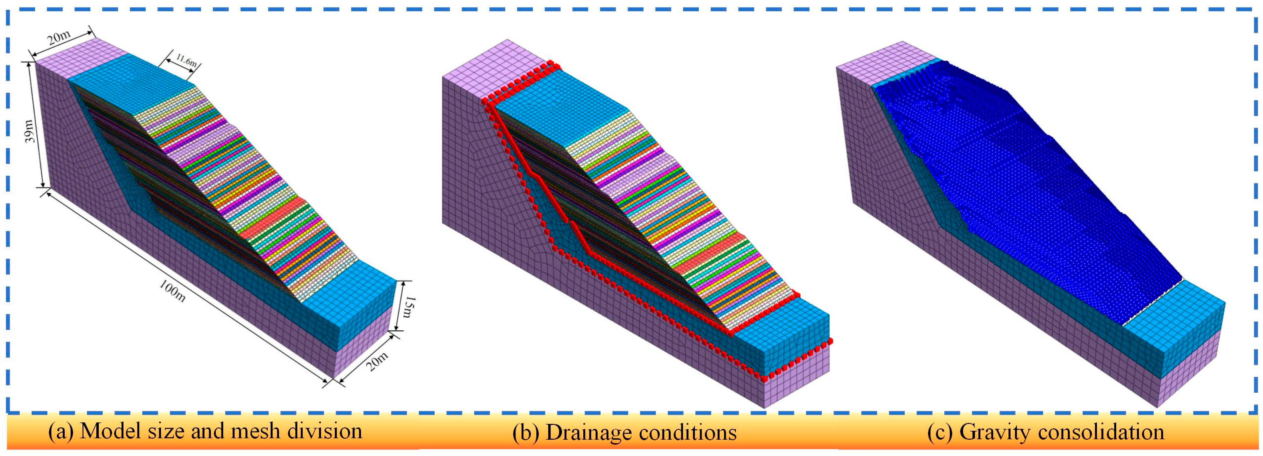 Consistent with the on-site engineering layout and geological conditions, the model incorporated targeted drainage configurations to replicate the actual consolidation process. Two key drainage interfaces were simulated to match the field drainage blind ditch system: one between the upper red clay fill and the underlying silty clay layer, and another between the silty clay layer and the bottom bedrock (Figure 1b). These interfaces were defined as permeable boundaries to facilitate pore water discharge during consolidation. Hydraulic parameters were set based on project-specific geological data: the red clay fill was assigned a permeability coefficient of 3.32 × 10−5 m/day (equivalent to 3.84 × 10−10 m/s), while the underlying silty clay and bedrock adopted typical values for similar geological formations. Pore water transport was modeled using Darcy’s law, with incompressible pore water assumed, and the consolidation analysis was implemented based on Terzaghi’s one-dimensional consolidation theory integrated in MIDAS GTS NX. The upper fill undergoes gravity-driven consolidation, with pore water escaping through the pre-defined drainage interfaces to simulate long-term post-construction settlement (Figure 1c).