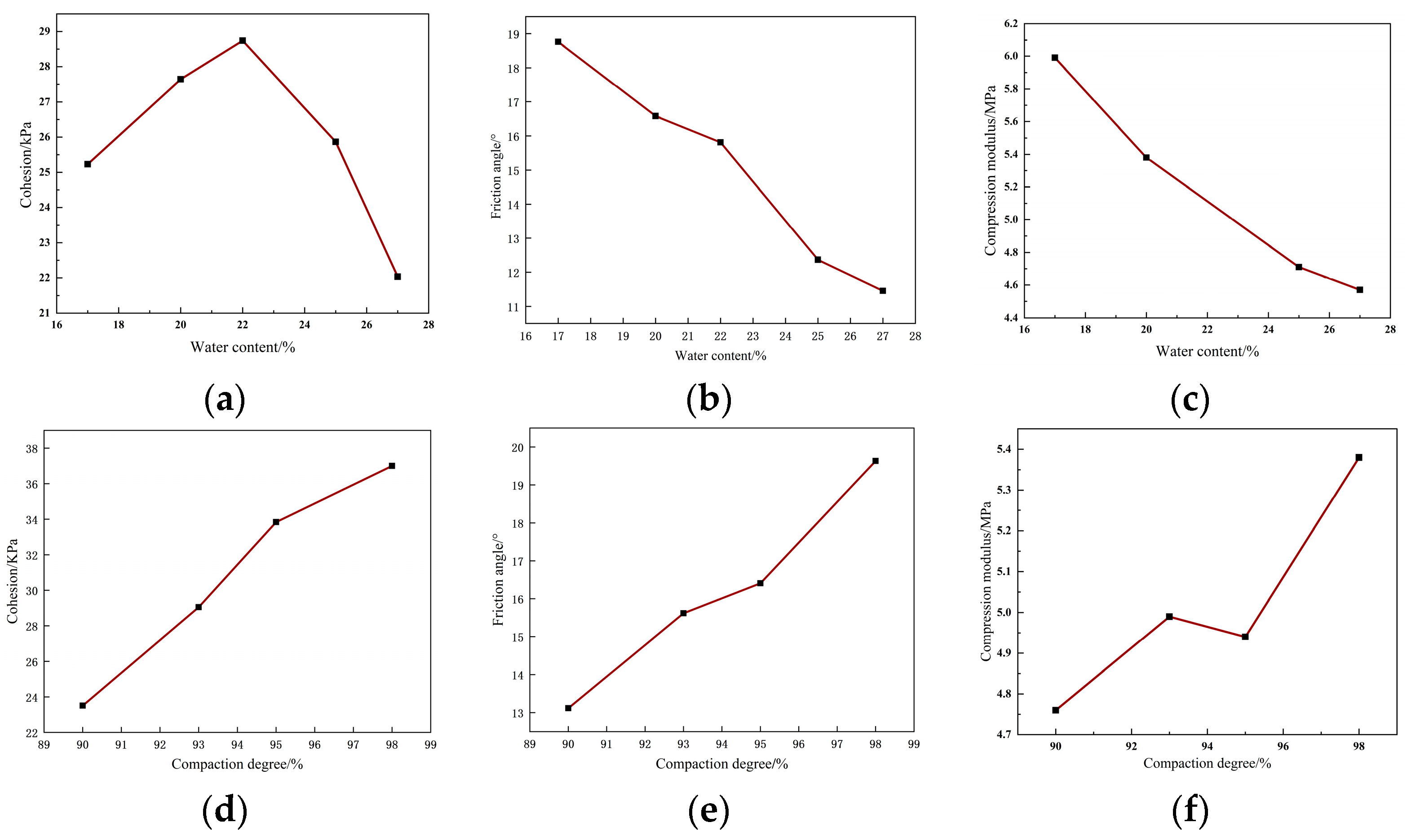 Figure 2. Variations in red clay mechanical parameters with water content and degree of compaction. (a) (variation curve of cohesion with water content): It depicts that cohesion first increases and then decreases as water content rises; (b) (variation curve of friction angle with water content): It shows that friction angle decreases gradually with increasing water content; (c) (variation curve of compression modulus with water content): It illustrates that compression modulus decreases continuously as water content increases; (d) (variation curve of cohesion with compaction degree): It reflects that cohesion increases with the rise of compaction degree; (e) (variation curve of friction angle with compaction degree): It shows that friction angle increases gradually as compaction degree rises; (f) (variation curve of compression modulus with compaction degree): It demonstrates that compression modulus increases overall with the rise of compaction degree (with a slight fluctuation in the middle).