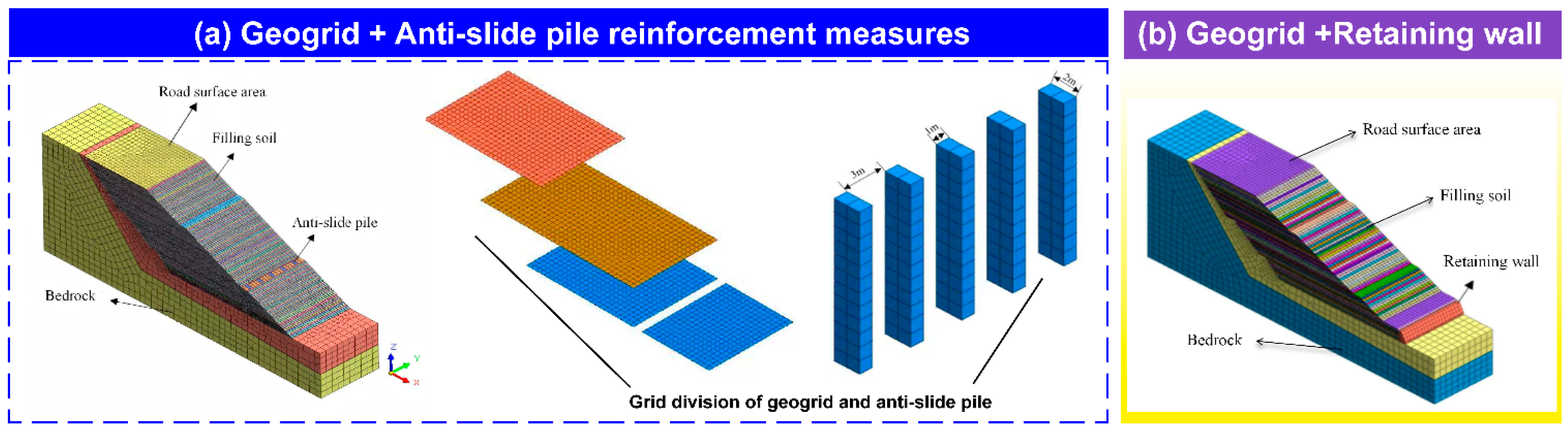 Two widely used countermeasures were modeled for the reference condition (w = 22%, DC = 93%, lift thickness = 30 cm): (a) geogrid layers combined with an anti-slide pile row; and (b) geogrid layers combined with a gravity retaining wall. As illustrated in Figure 3, it depicts the three-dimensional models and grid division diagrams of these two geogrid-reinforced measures.