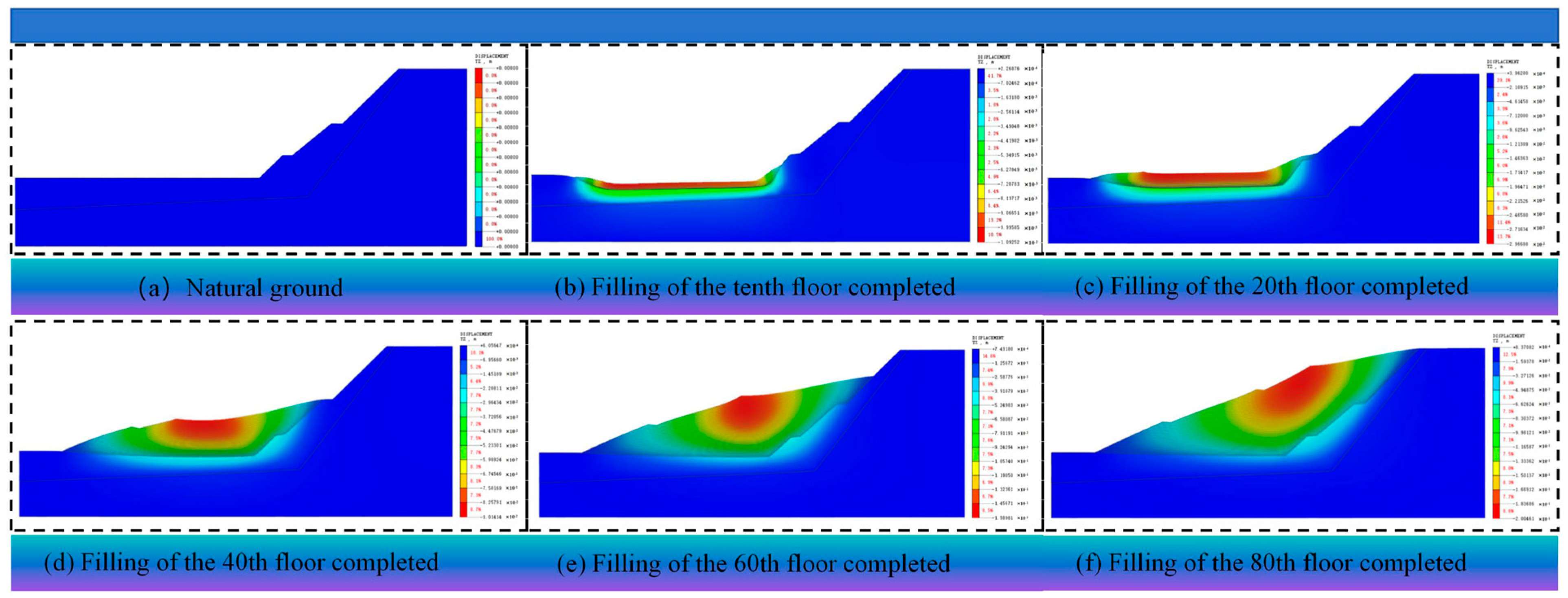 Under the representative condition (water content 22%, lift thickness 30 cm, degree of compaction 93%), Figure 3 presents the vertical displacement cloud diagram of the layered filling process of a red clay high-fill embankment. The simulated settlement field exhibits a consistent pattern during staged filling: the maximum settlement concentrates near the slope surface and the upper portion of the fill, while deformation in the natural foundation is limited. At the same elevation, edge zones show a larger settlement than the pavement center. These features become pronounced as construction progresses from the initial natural ground (Figure 3a) to the completion of the 10th (Figure 4b), 20th (Figure 4c), 40th (Figure 4d), 60th (Figure 4e), and 80th (Figure 4f) lifts, reflecting a self-weight dominated response of the embankment fill.