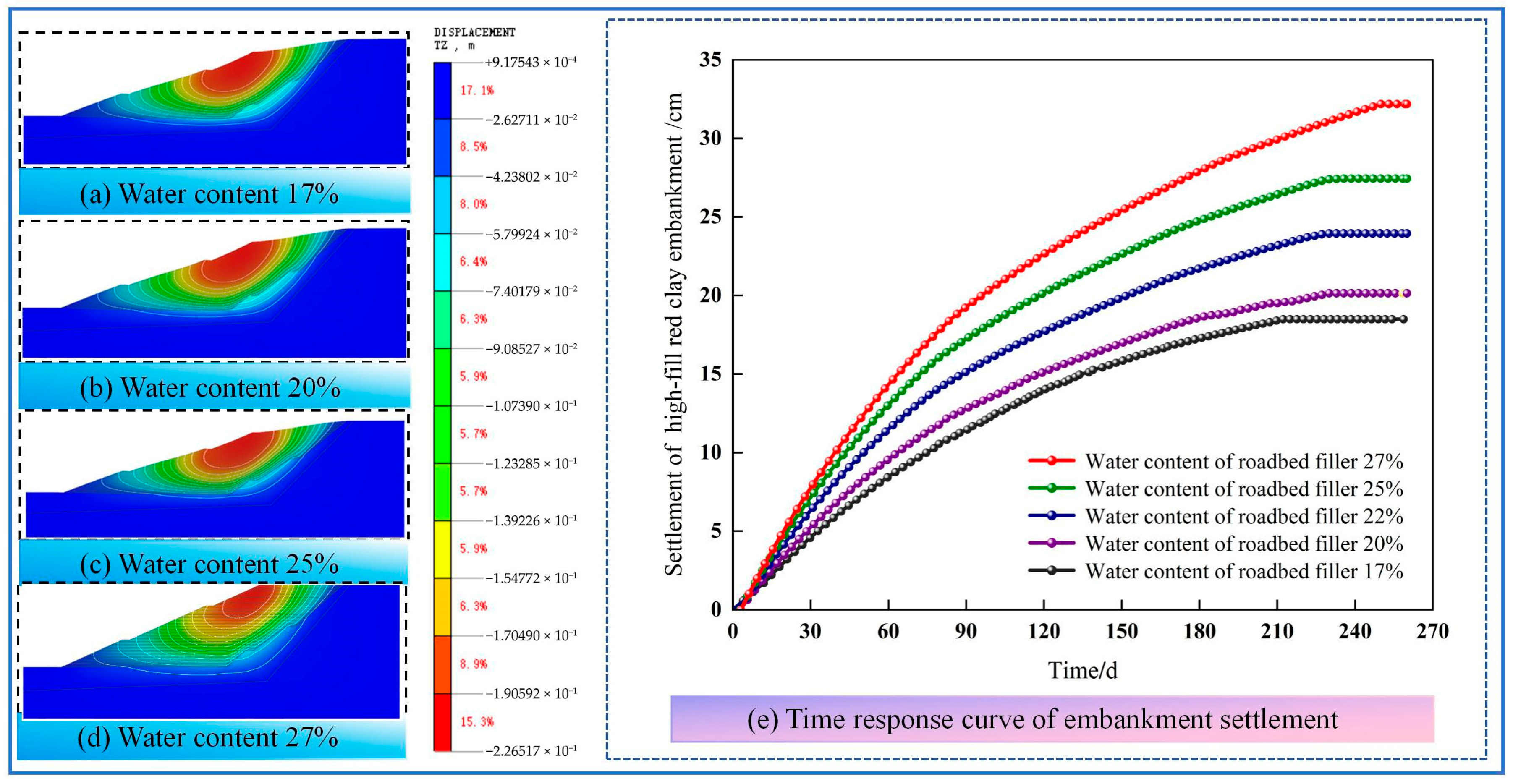 Figure 5. Contour maps of vertical displacement and time-response curves of settlement for embankments with different filler water contents.