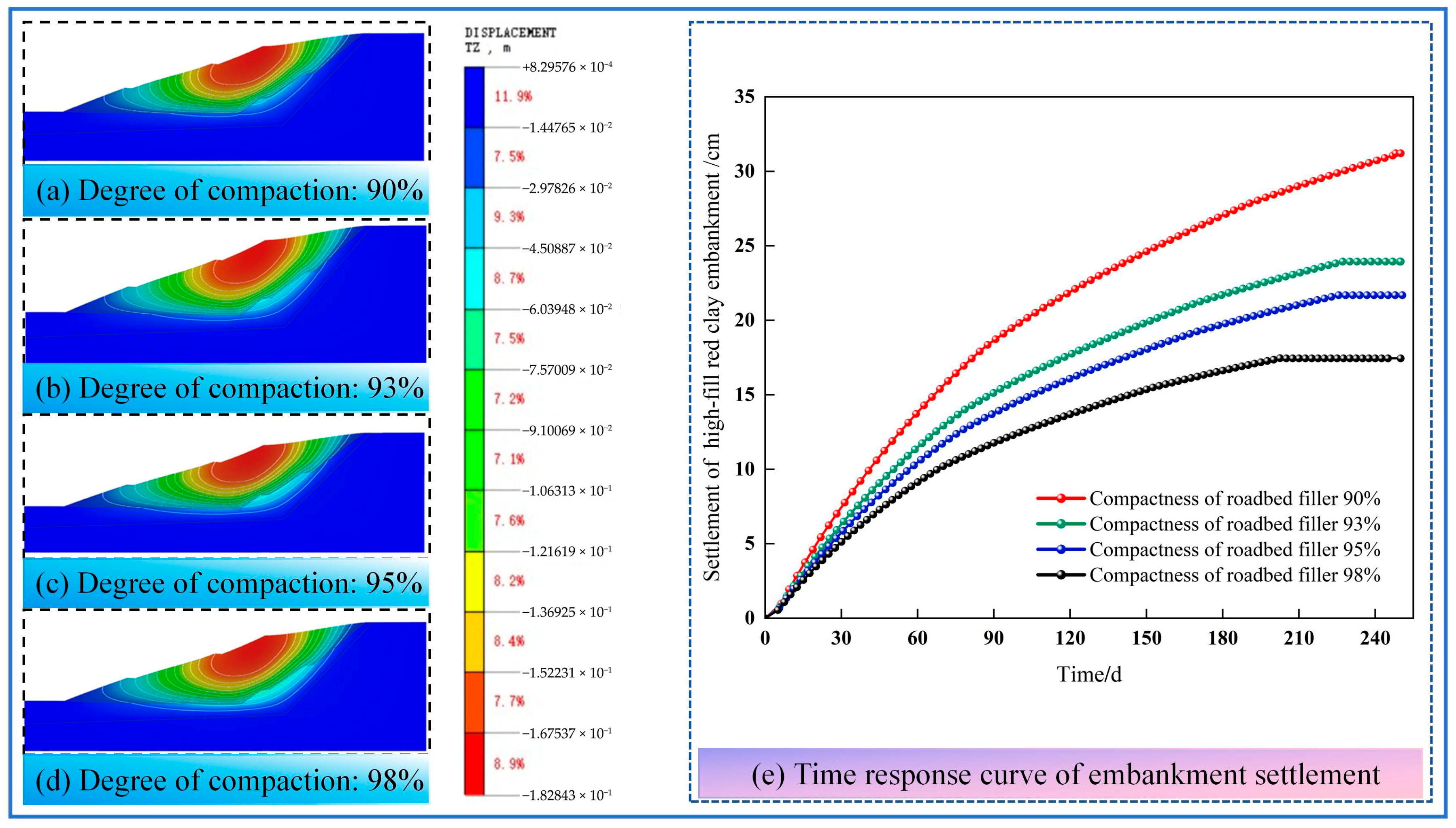 In China, the minimum requirement for the degree of compaction of high-fill embankment fill is specified in the Technical Code for Construction of Highway Subgrades (JTG/T 3340-2018) [32]. For high-grade highway embankments in red clay regions, the degree of compaction for the embankment body (within the depth range of 0–80 cm) shall not be less than 96%, and for the lower part of the embankment (below 80 cm depth), it shall not be less than 94%. The DC levels (90%, 93%, 95%, 98%) selected in this study cover the common construction quality range and the standard requirement threshold, which is of practical significance for exploring the influence of compaction quality on settlement behavior.