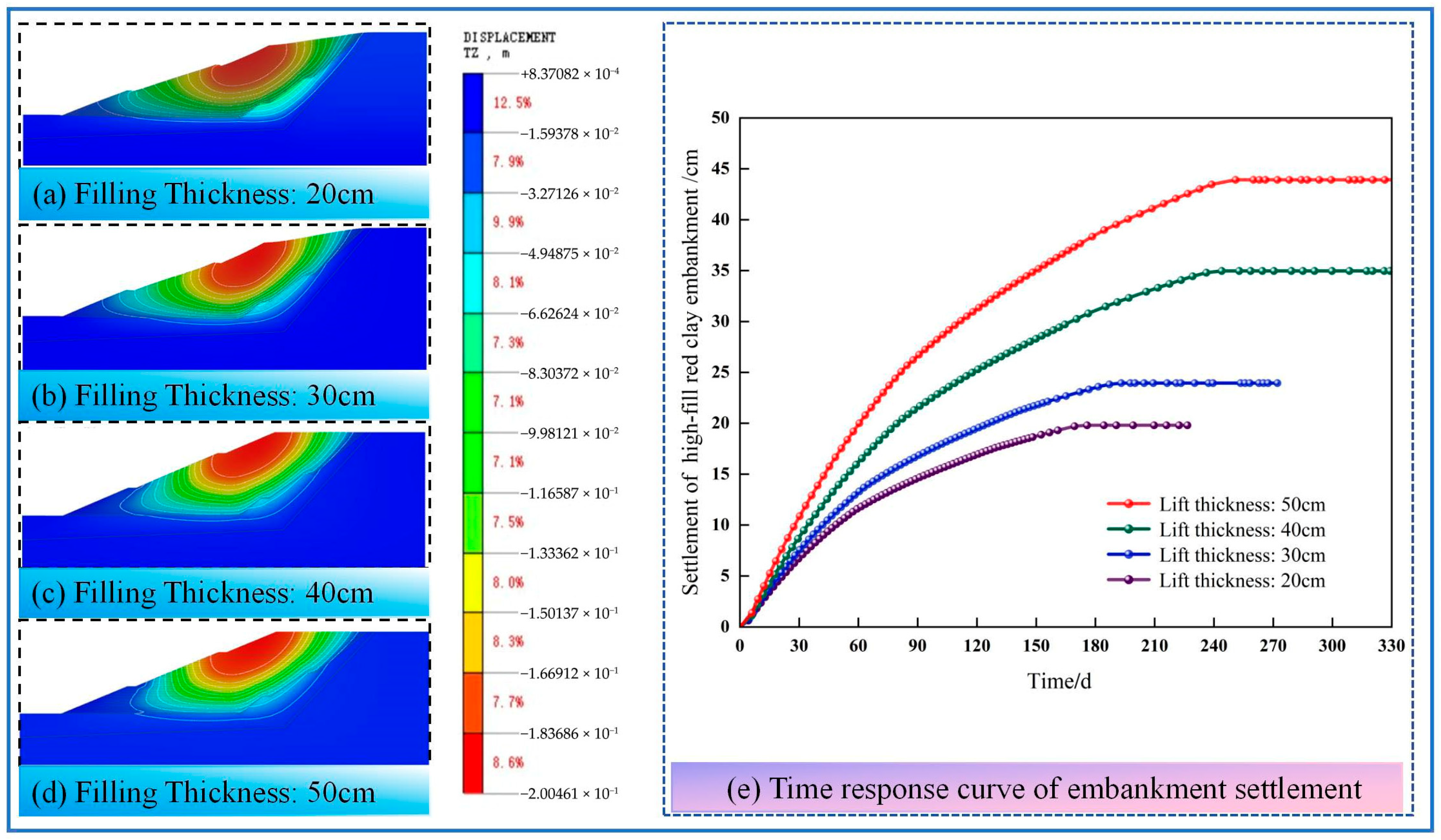 Figure 7. Contour maps of vertical displacement and time-response curves of settlement for embankments with different lift thicknesses.
