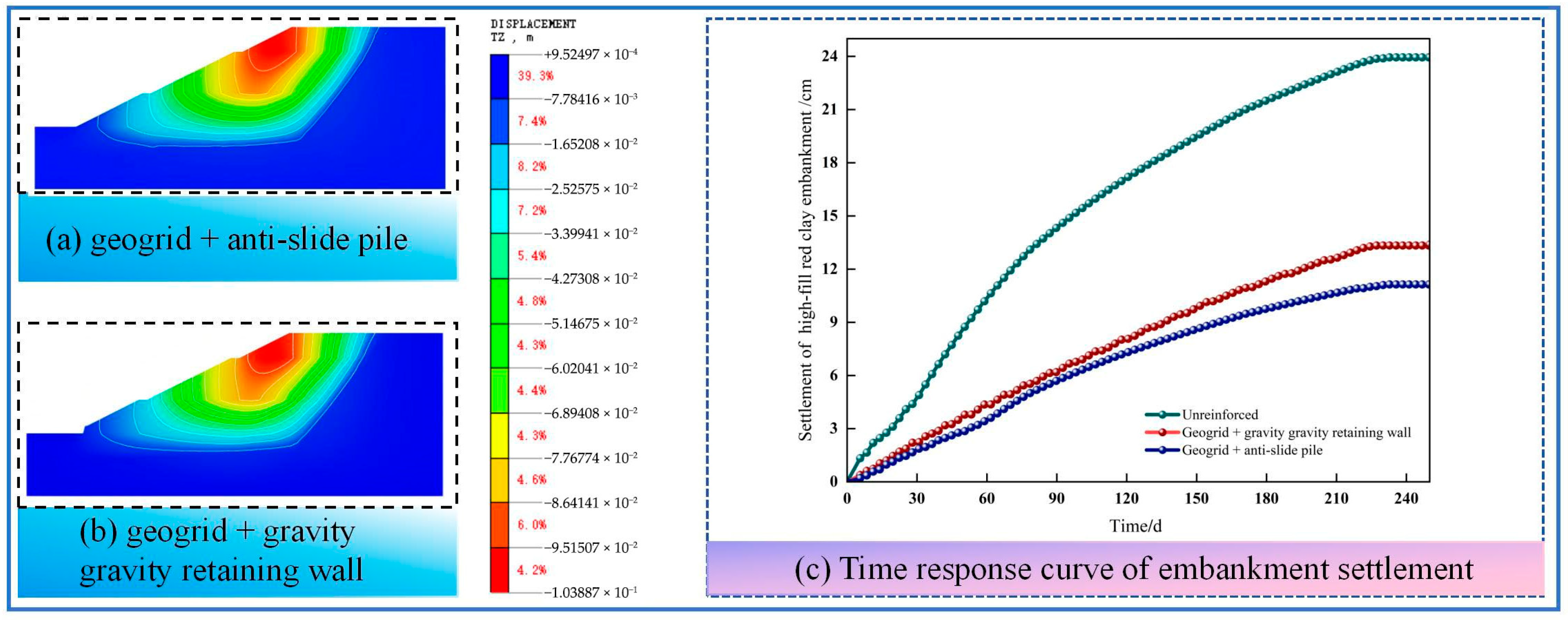 Figure 8 shows the time-response curves of embankment settlement under different reinforcement measures (unreinforced, geogrid + anti-slide pile, geogrid + gravity retaining wall). Over the simulation period, the unreinforced red clay embankment stabilizes at a settlement of approximately 23.9 cm. Incorporating geogrid + anti-slide piles reduces the maximum settlement to 10.3 cm, a 56.9% decrease relative to the unreinforced case. The geogrid + gravity retaining wall scheme limits settlement to 13.4 cm, corresponding to a 43.9% reduction. Both countermeasures thus markedly mitigate post-construction settlement, with the geogrid-pile system providing the larger reduction. The calculated stability coefficient increases by 54.5% for geogrid + anti-slide piles and by 36.4% for geogrid + gravity retaining wall, indicating notable improvements in global stability.