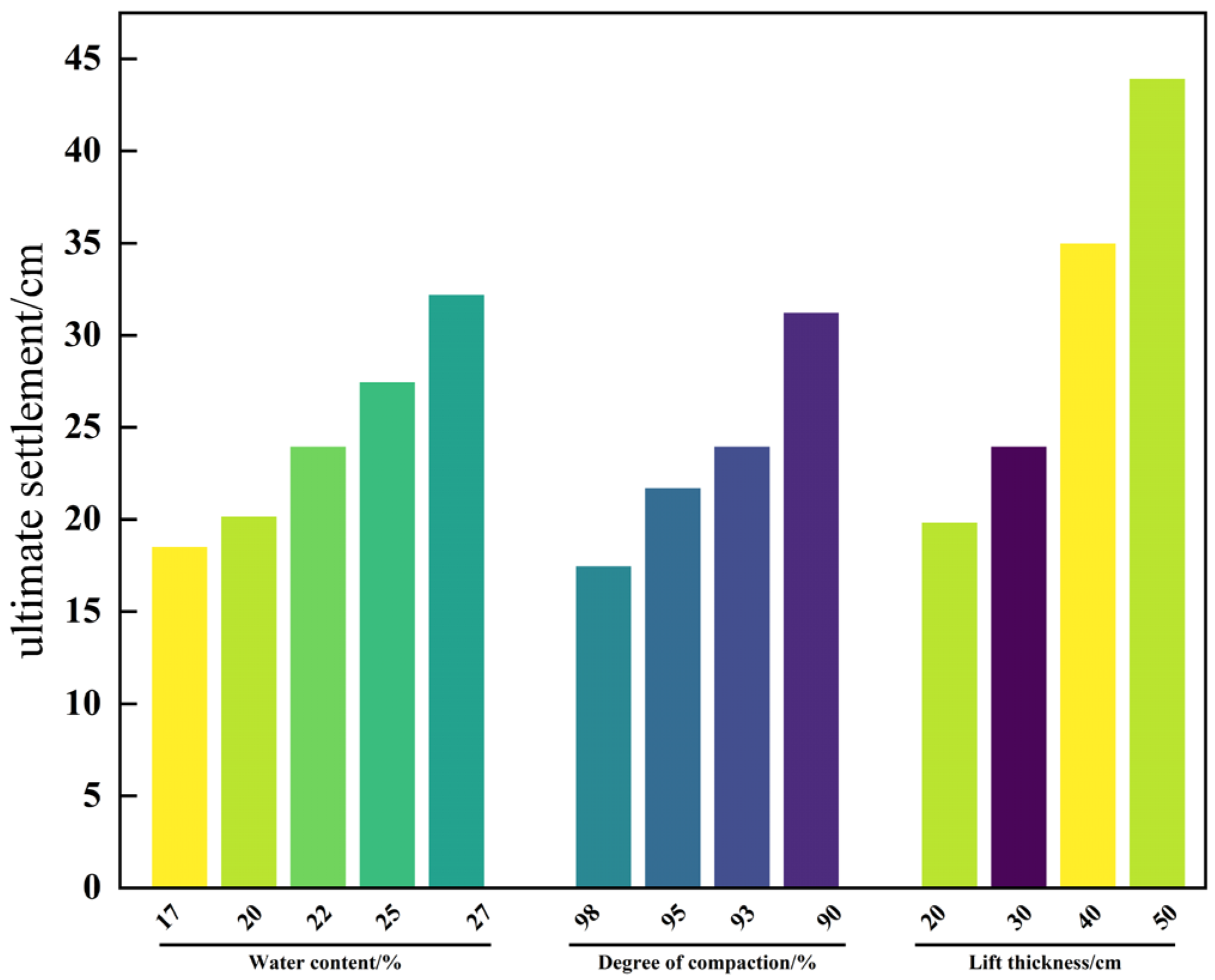 Thinner lifts are more effectively compacted at depth, yielding a higher in situ density and stiffness and thus reduced compressibility; thicker lifts hinder deep compaction, leaving a looser soil skeleton that is more susceptible to recompression under self-weight. Sensitivity is particularly pronounced in the 30–40 cm range, where modest increases in lift thickness can cause a significant rise in final settlement.